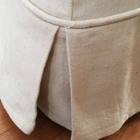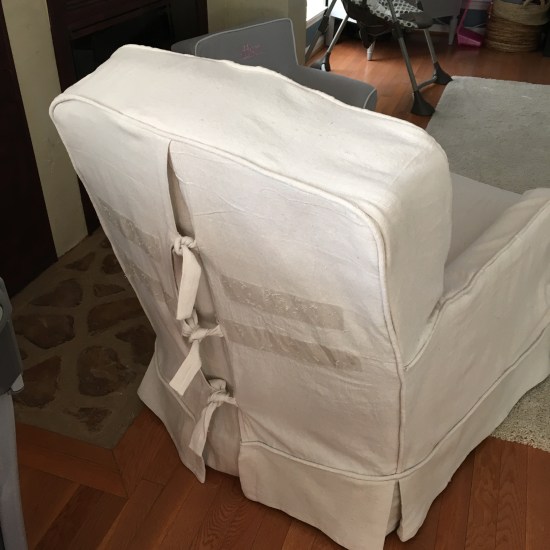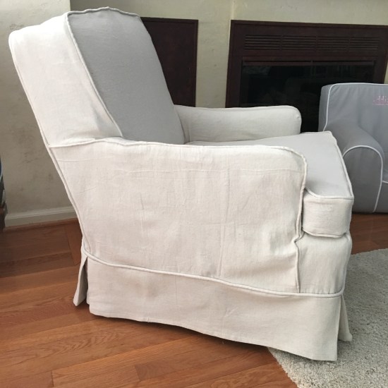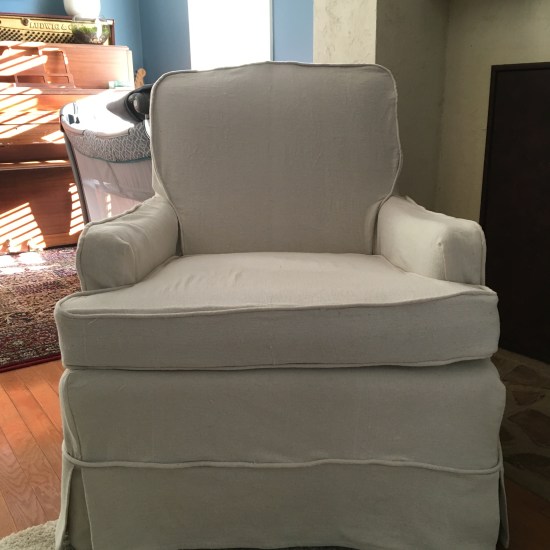 Well here he is! Benjamin Paul Lashua. He came on time (June 8th) and is just as perfect as possible. But I’m not biased. When I last posted I still had to finish the bottom of the chair and put a panel on the back to conceal the original chair in the opening. I was able to knock this all out while my daughter and her husband spend two days in the hospital. I made the piping ahead of time as well as hemmed the skirt so I could spend as much time as possible holding Ben and playing with Addy. I kept it simple by only adding corner pleats to the skirt.