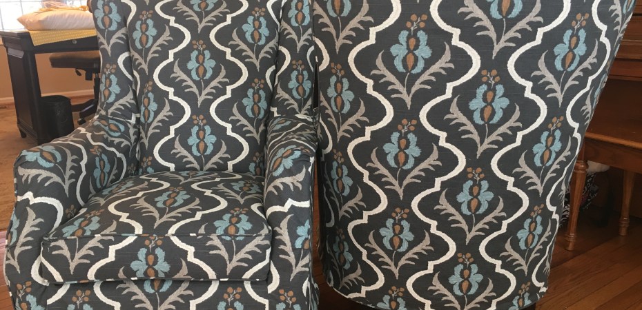 So with my scissors, pins, and bobbins all loaded I began the transformation. I was antsy to see the end result. But slipcovers are a patient and methodical process….there would be no races on these. There was a lot to match and think through. Because of the directional print with a repeat, I had my client order extra fabric. I had to be very careful in cutting my pieces and matching. I wanted to match as much as I could not only on each chair singly but in relationship to each other and from the back view to give the chairs a professional clean and upholstered look. I think I achieved that.