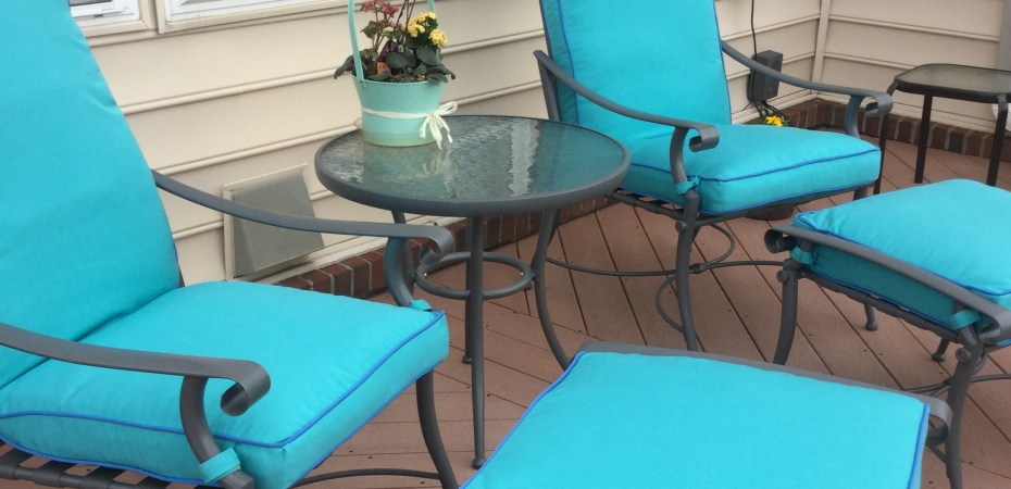 The pollen is done for the most part, and you have cleaned and re-cleaned the patios and porches to rid it of the fine yellow mist of gunk that seems to get into the tiniest of cracks. Now that this is behind us and warmer weather is finally here, it’s time to put out our porch patio cushions, grab a cup of coffee or a glass of wine, your summer reading and relax. But wait….your cushions may need attention too after years of wear, weather, sun and neglect.