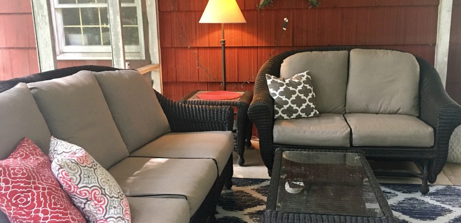 Though Jessica lives in PA, she travels back and forth to northern VA for business periodically. So she loaded up her vehicle with the thirteen cushions. After making thirty five yards of piping, I began work on the custom cushions for a three-seat patio couch, two-seat loveseat, side chair and ottoman.