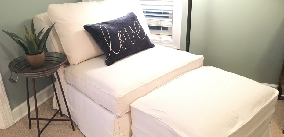 What a great place to put your feet up on, read a good book or take a nap. I think my husband likes (and maybe even loves) it now. Stay tuned for the complete room makeover. Just a few finishing touches and it’s ready to go!