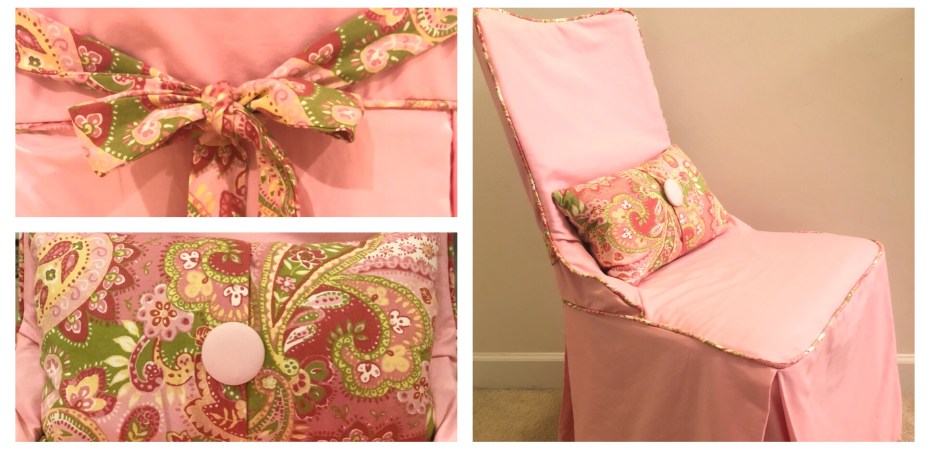 Cording made from the floral fabric outlined the chair and set off the stripe banded bottom of the corner pleated floor length skirt. A big floral bow and a small accent pillow made from scraps and finished off with a button from the valance, finishes off this sweet chair.