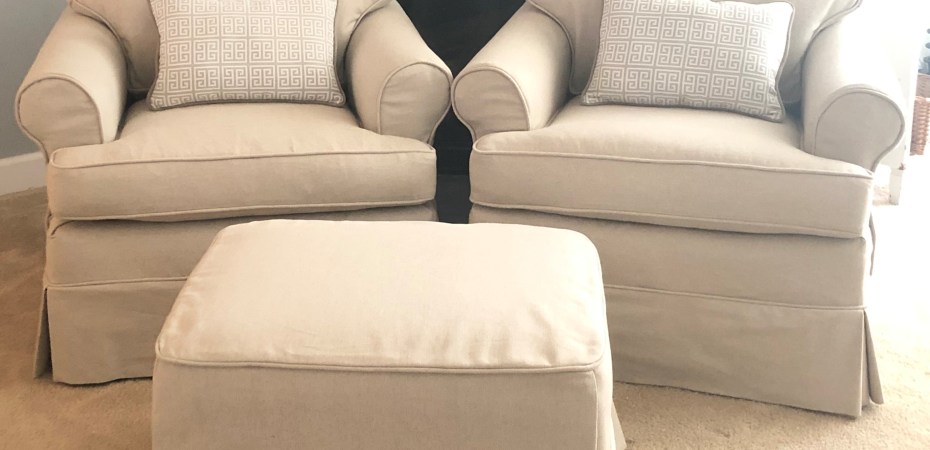 What a remarkable difference and perfect update a slipcover made on these two chairs and ottoman. These chairs just jumped decades into 2019.