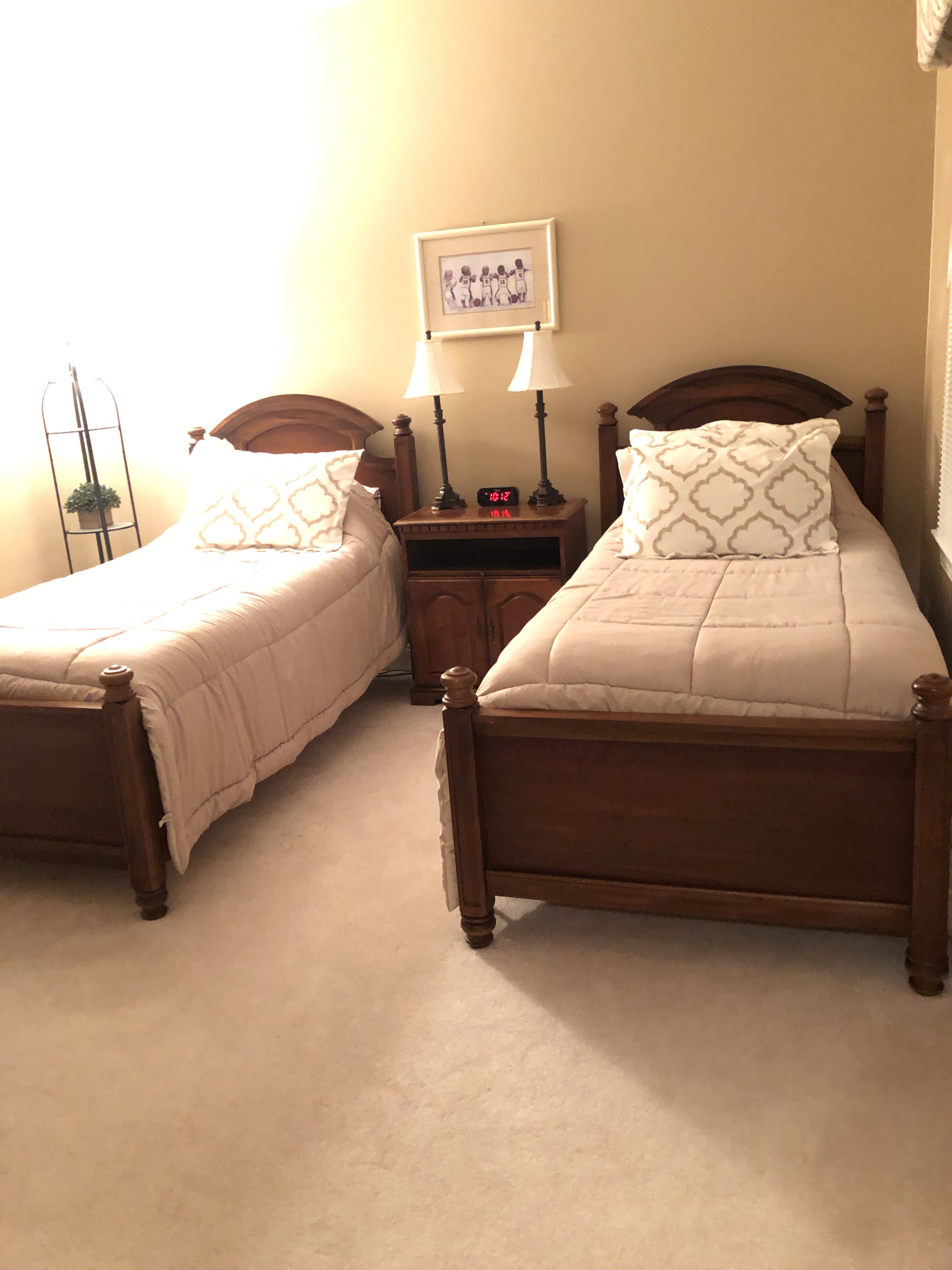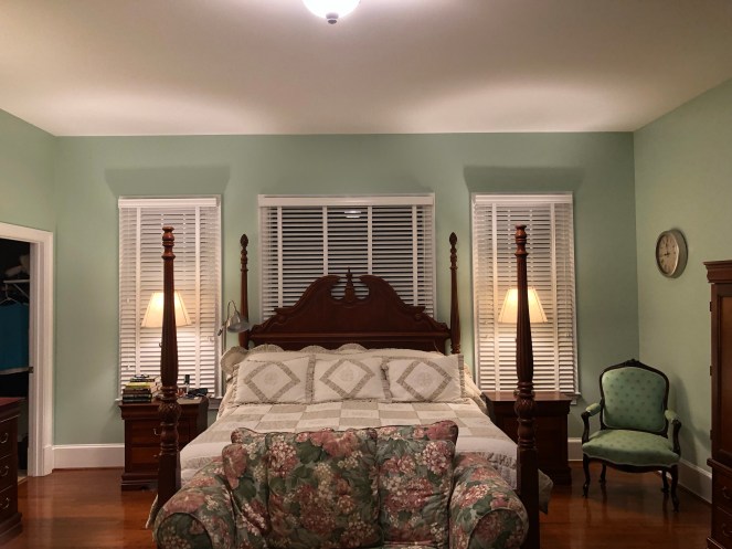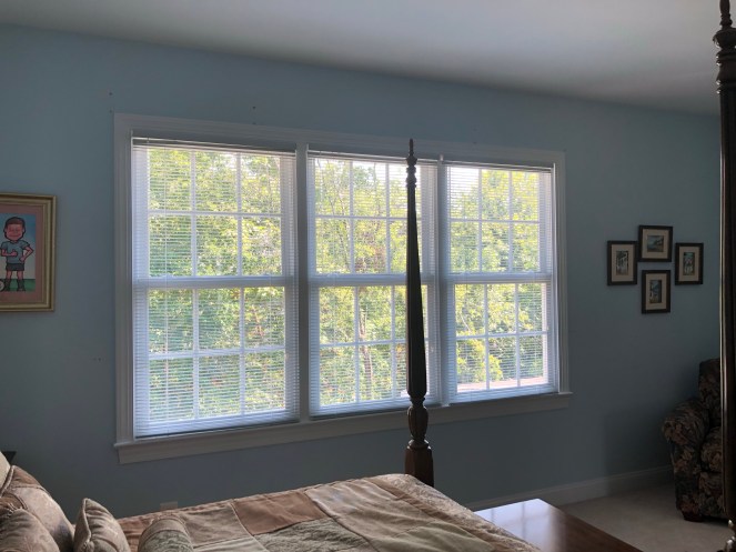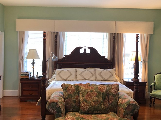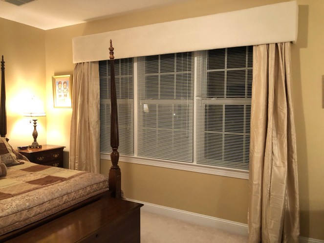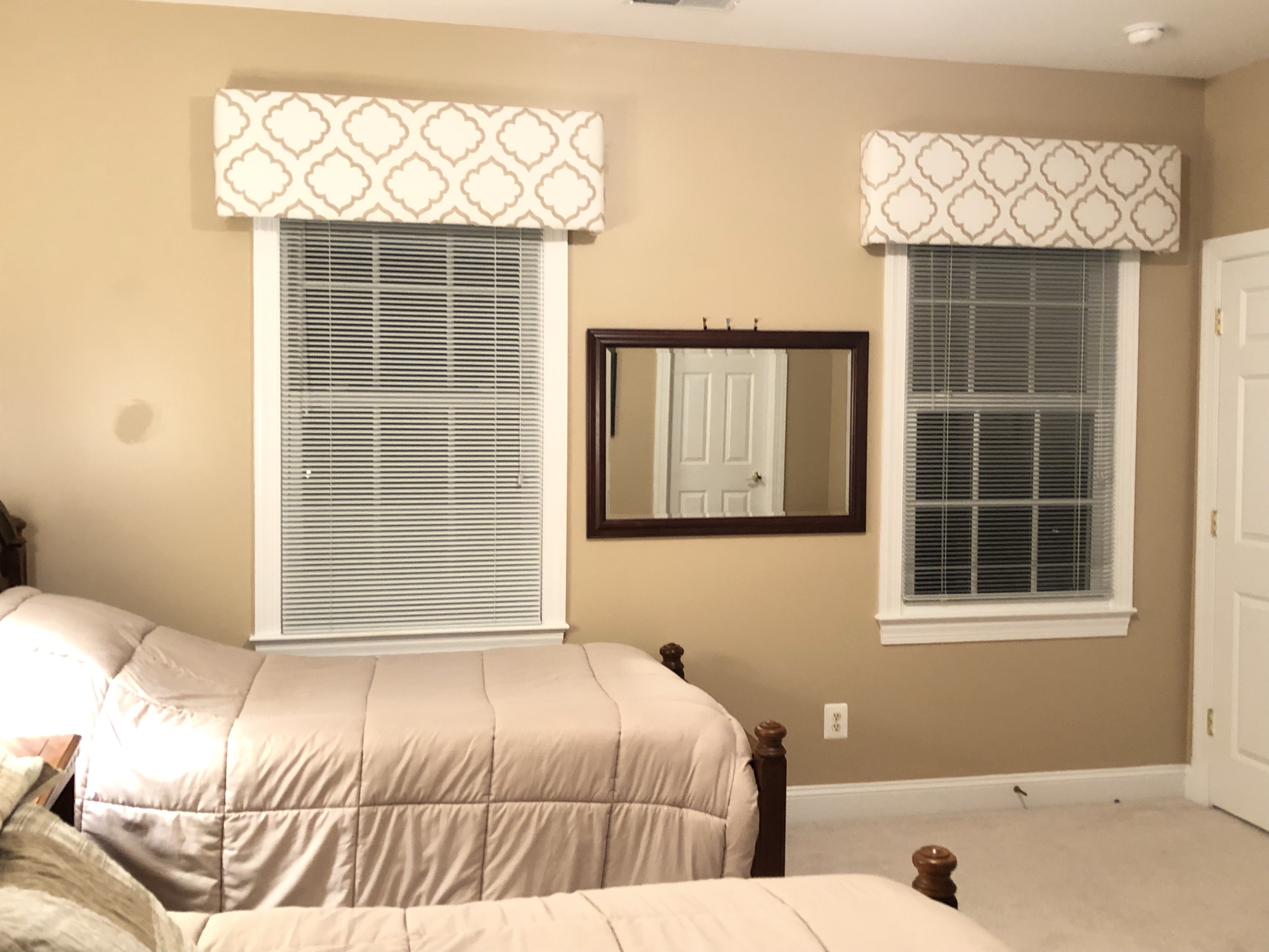 One more window would complete this cornice project. This bedroom would also feature an extra long cornice with a solid suede like fabric. The texture and simplicity of the fabric is perfect for a mature looking room when her grown son’s come home to visit.