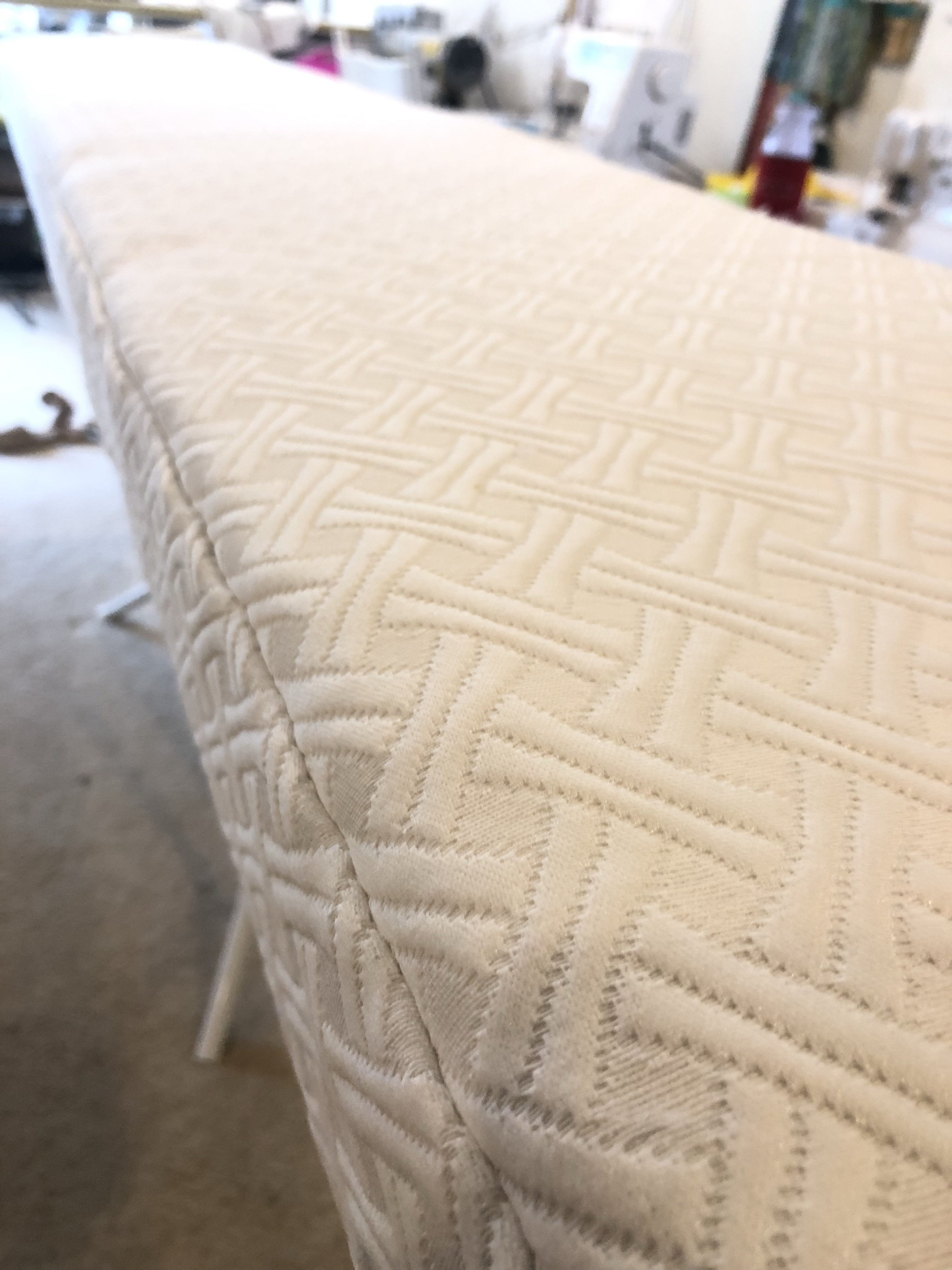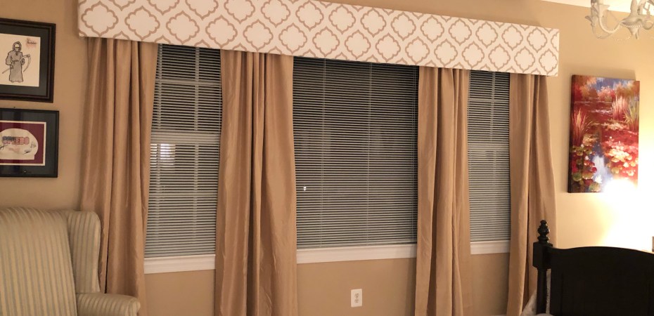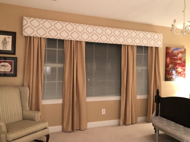 The master bedroom had three separate windows. Though there were a few options on how to approach this, we decided to make three separate cornices butted up against each other and each with a curtain rod installed underneath to install curtains for a softer finished look that frames the bed and creates a focal piece when entering the room. A creamy embroidered fabric from Hobby Lobby was chosen to coordinate with her bedding.