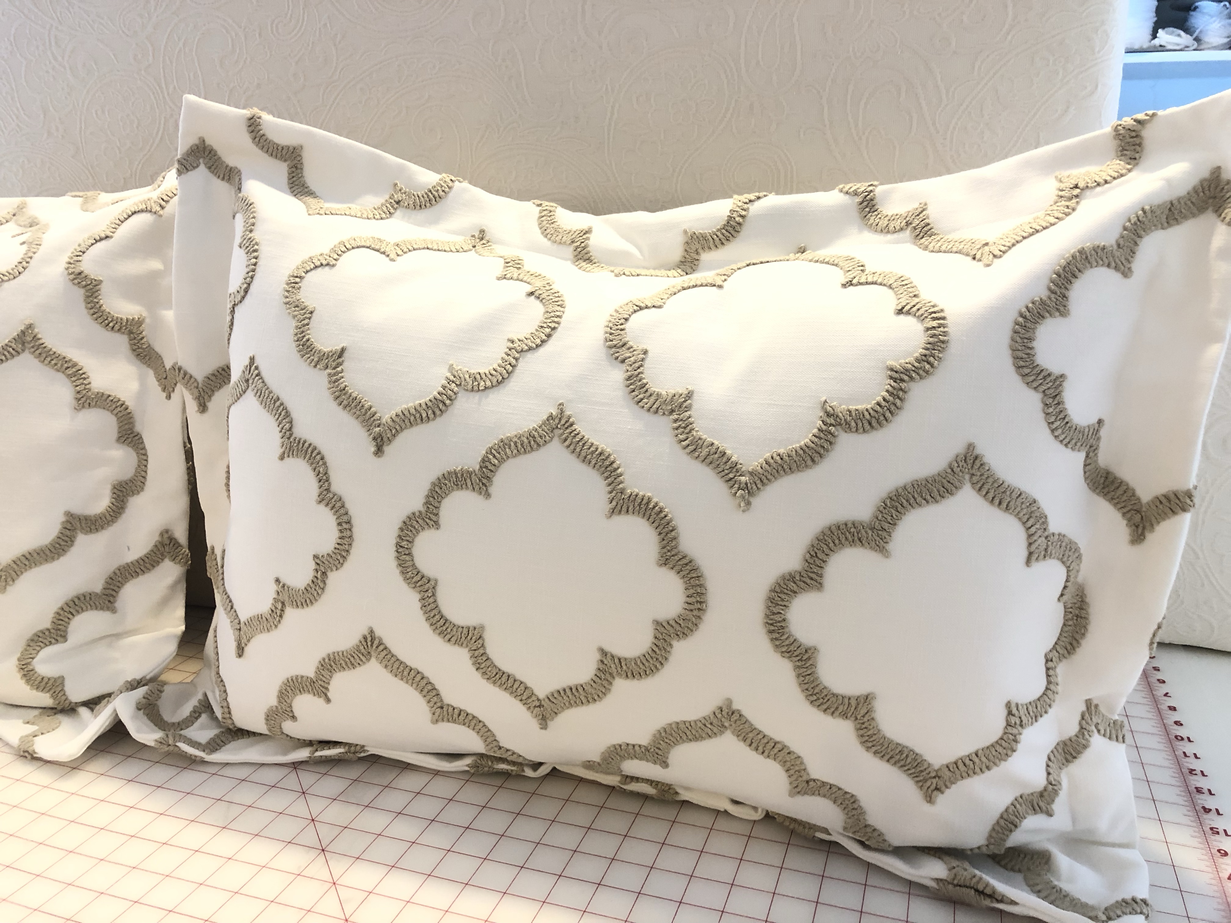 Happy with the results, Leslie decided to have cornices made for several more windows. She picked a gorgeous embroidered fabric for a bedroom with twin windows as well as the adjoining bedroom with an extra long window. I made a few flanged pillow shams with the extra fabric.