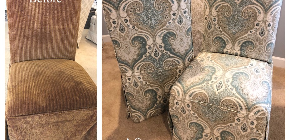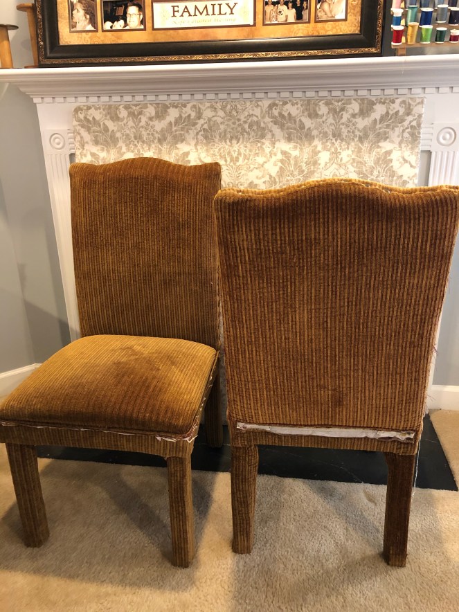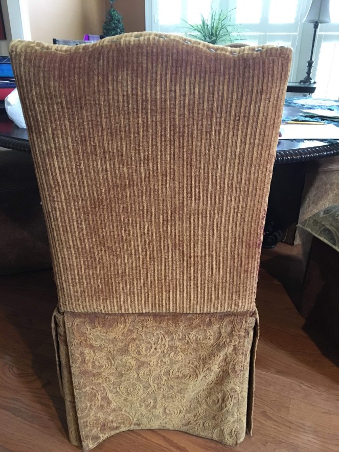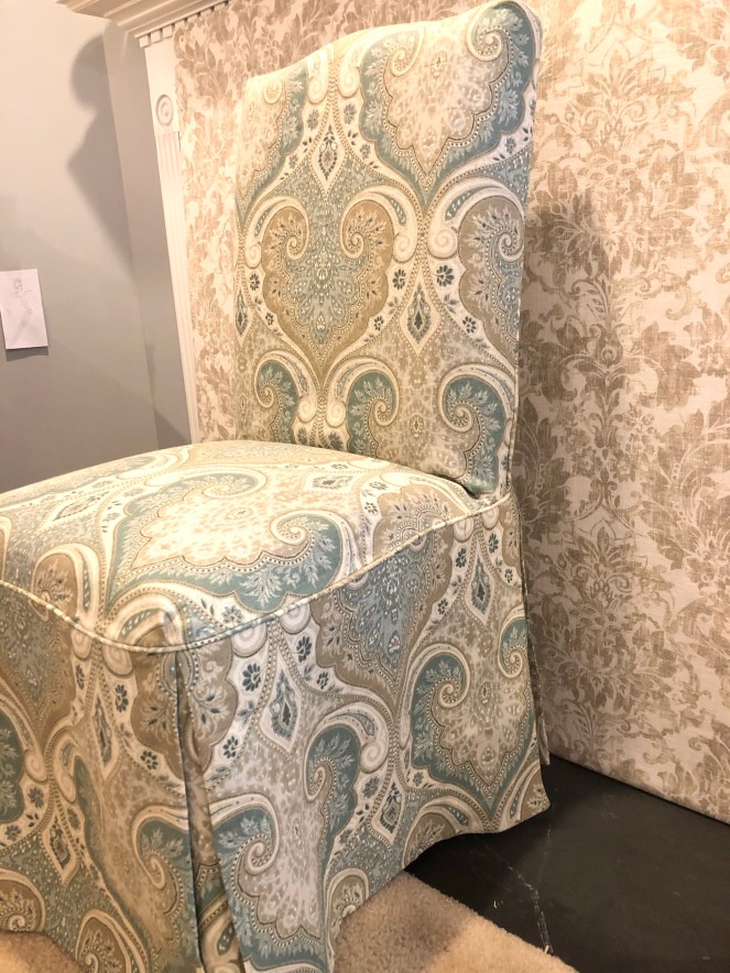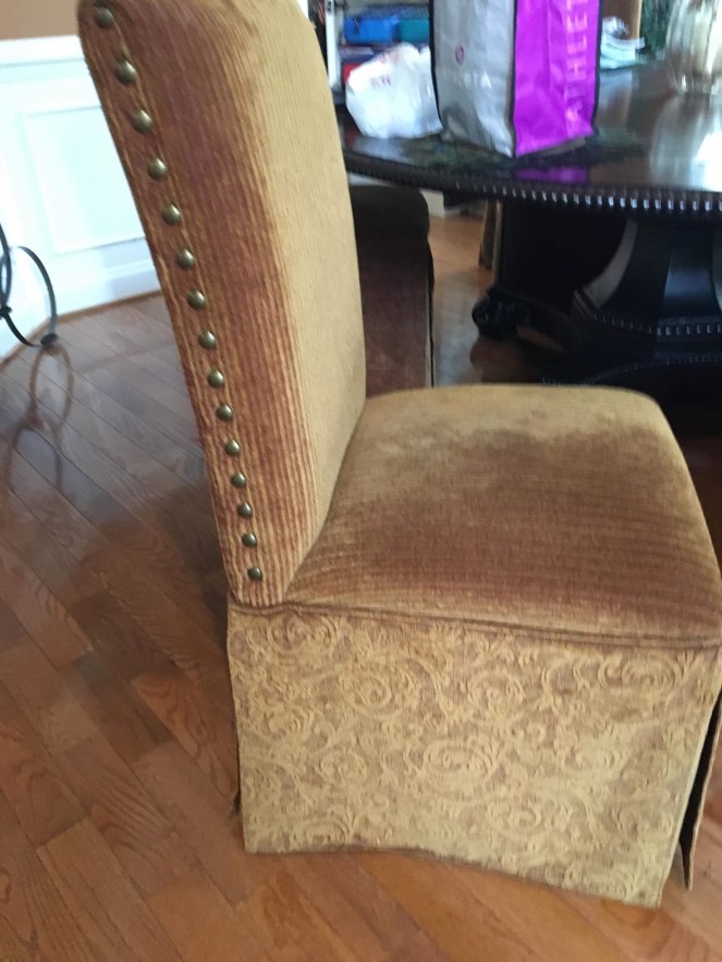 My client brought these very loved parson chairs that were the purr-fect height for her table. Unfortunately, the cats loved them too, using the skirts as their purr-sonal scratching post (OK, enough with the puns). I really couldn’t wait to see the complete transformation new fabric would make on these chairs.
