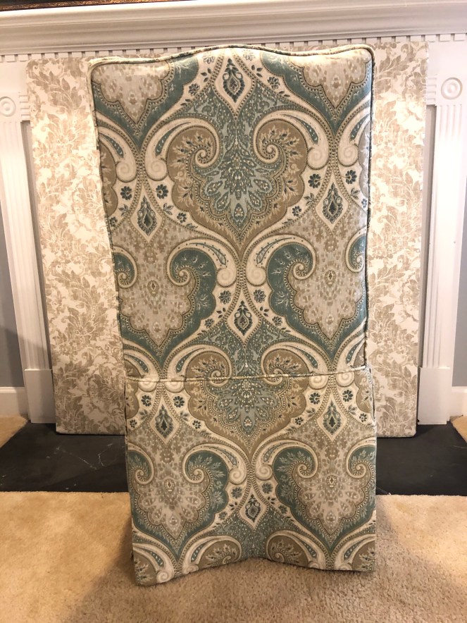 Knowing that my client wanted to be able to wash the final slipcovers as her cats would likely continue to sleep on the chairs, I pretested a sample piece of the fabric to see how it would wash. I shrank a bit but washed beautifully. After washing all of the fabric and cutting off the existing skirt, I proceeded to make the very tailored, perfectly matched, skirted slipcovers. Crisp, fresh and in a beautiful color pallet that will serve her well for today’s color schemes.