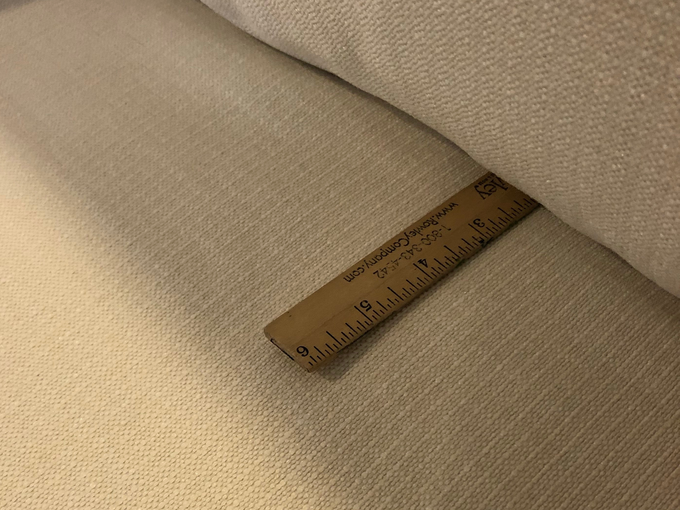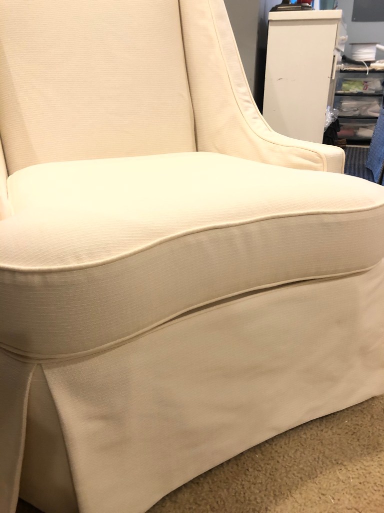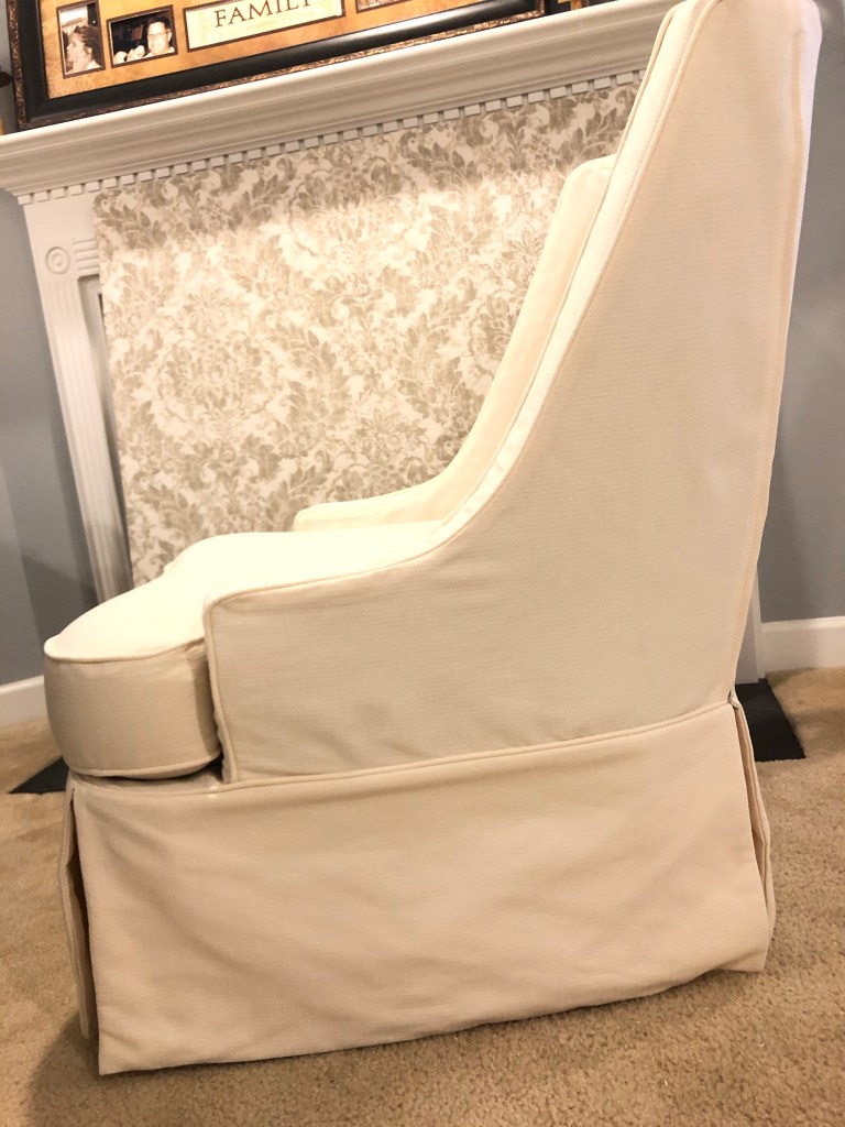 This chair in particular had a very tight and shallow “tuck-in” room on the seat deck and and bottom of the back. Instead of using my fingers to push the excess fabric needed to hold the slipcover in place in the tight space, I found a handy tool that easily slides in and creates a nice clean look….the 6″ wood ruler. Who knew! I love that I can always learn something new in this job.