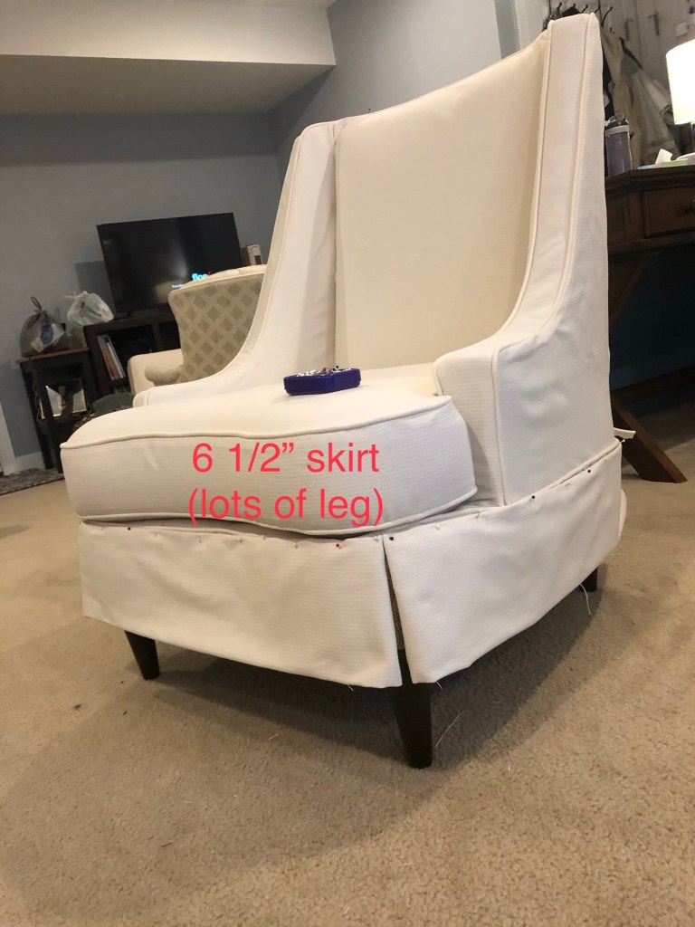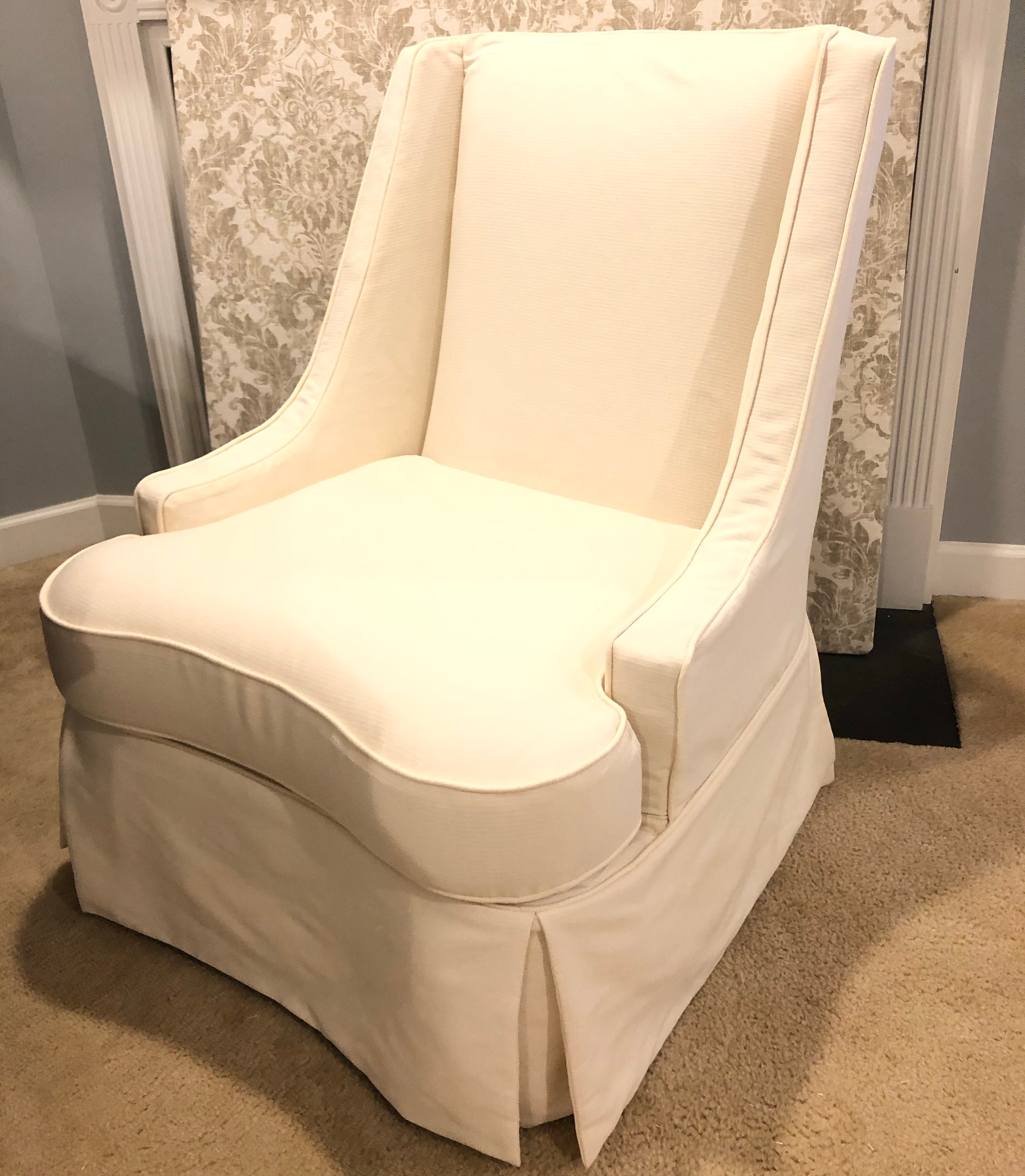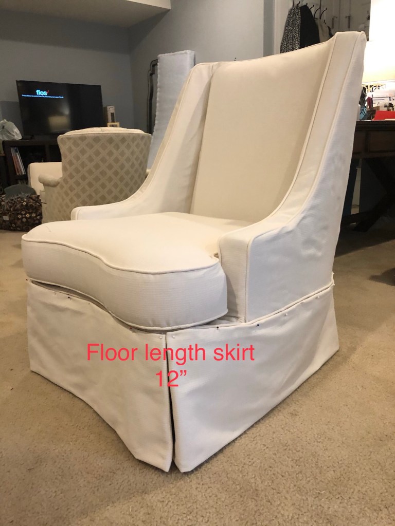 When making a slipcover, this is the perfect time to add or change to the visual design of the chair. This chair in particular could have had the same corded bottom to resemble the original style, a shorter skirt or a full length skirt. We decided to change it up a bit by adding a floor length skirt to soften the lines even more. I think it was the perfect change.