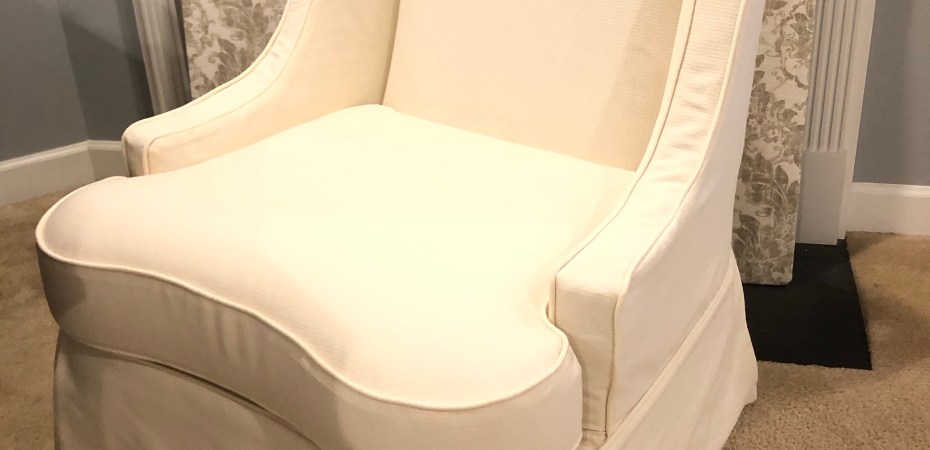 This chair in particular had a very tight and shallow “tuck-in” room on the seat deck and and bottom of the back. Instead of using my fingers to push the excess fabric needed to hold the slipcover in place in the tight space, I found a handy tool that easily slides in and creates a nice clean look….the 6″ wood ruler. Who knew! I love that I can always learn something new in this job.
