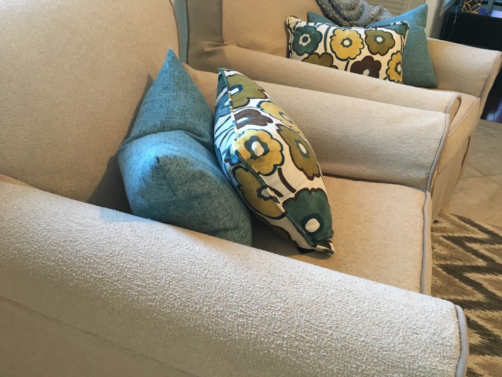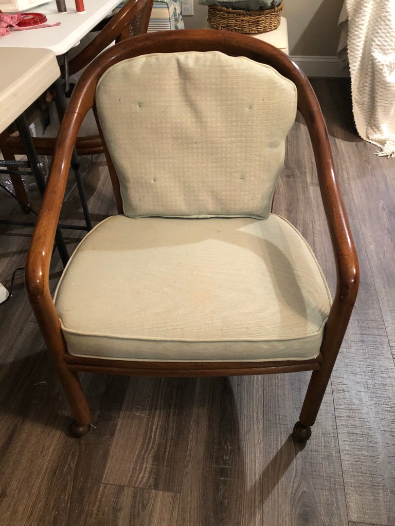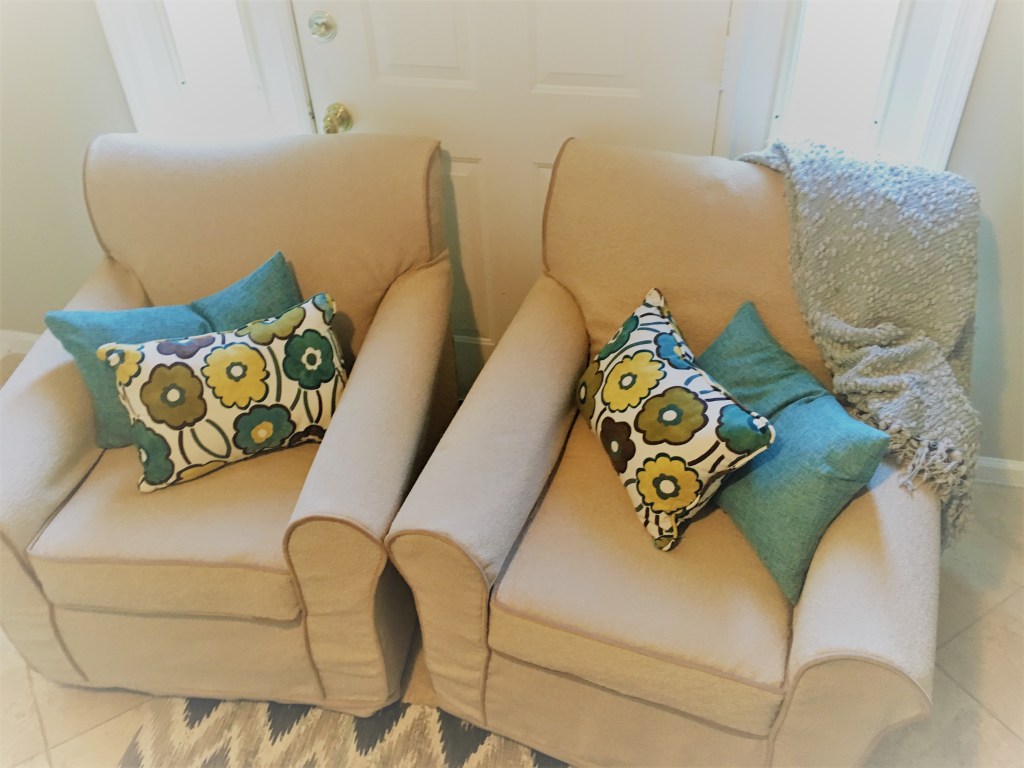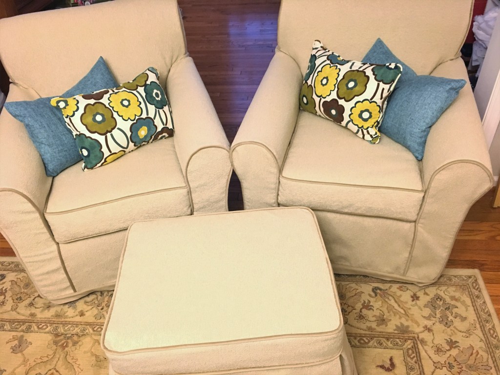 I bought this pair of comfortable used club chairs specifically for the center space in the bonus room to sit and watch TV in (see a previous post Bonus Chairs in Boucle for the details on this slipcover project). One of my many projects this spring (and while on “social distancing”) is to make a light blue linen blend summer set of slipcovers.