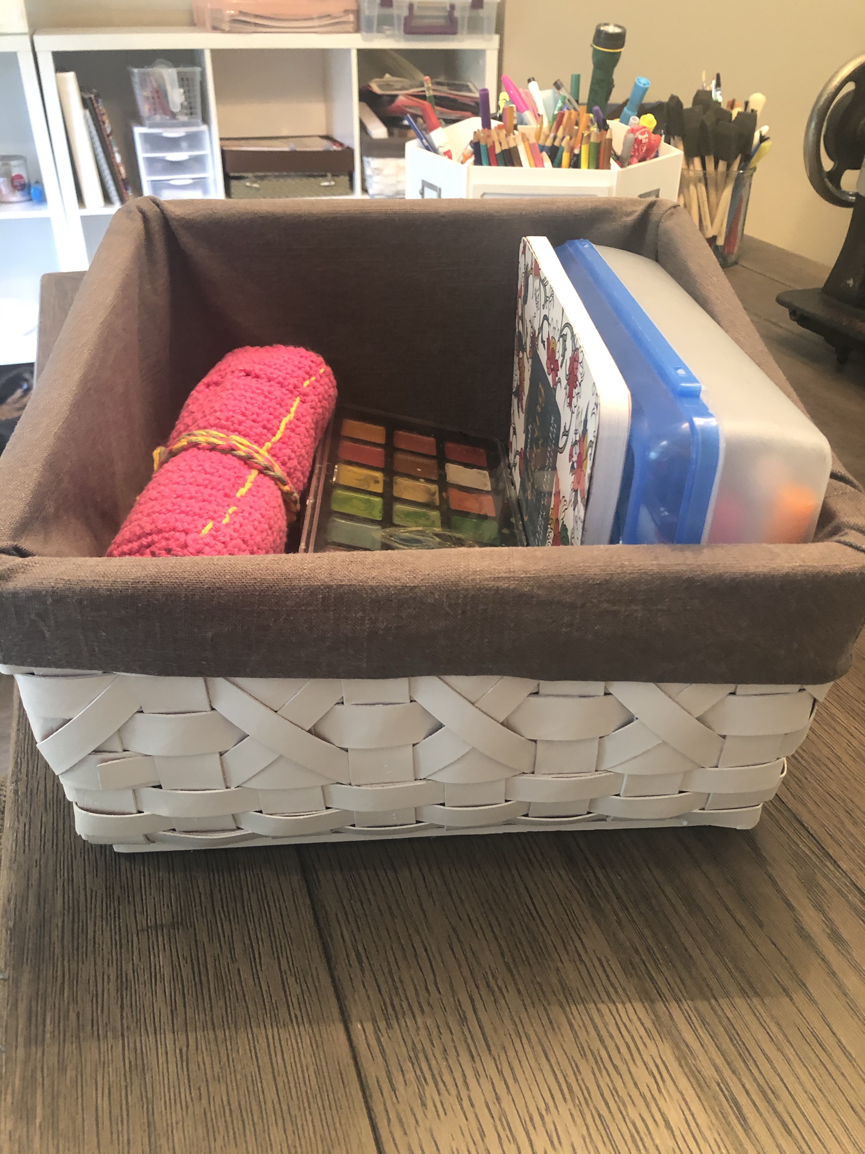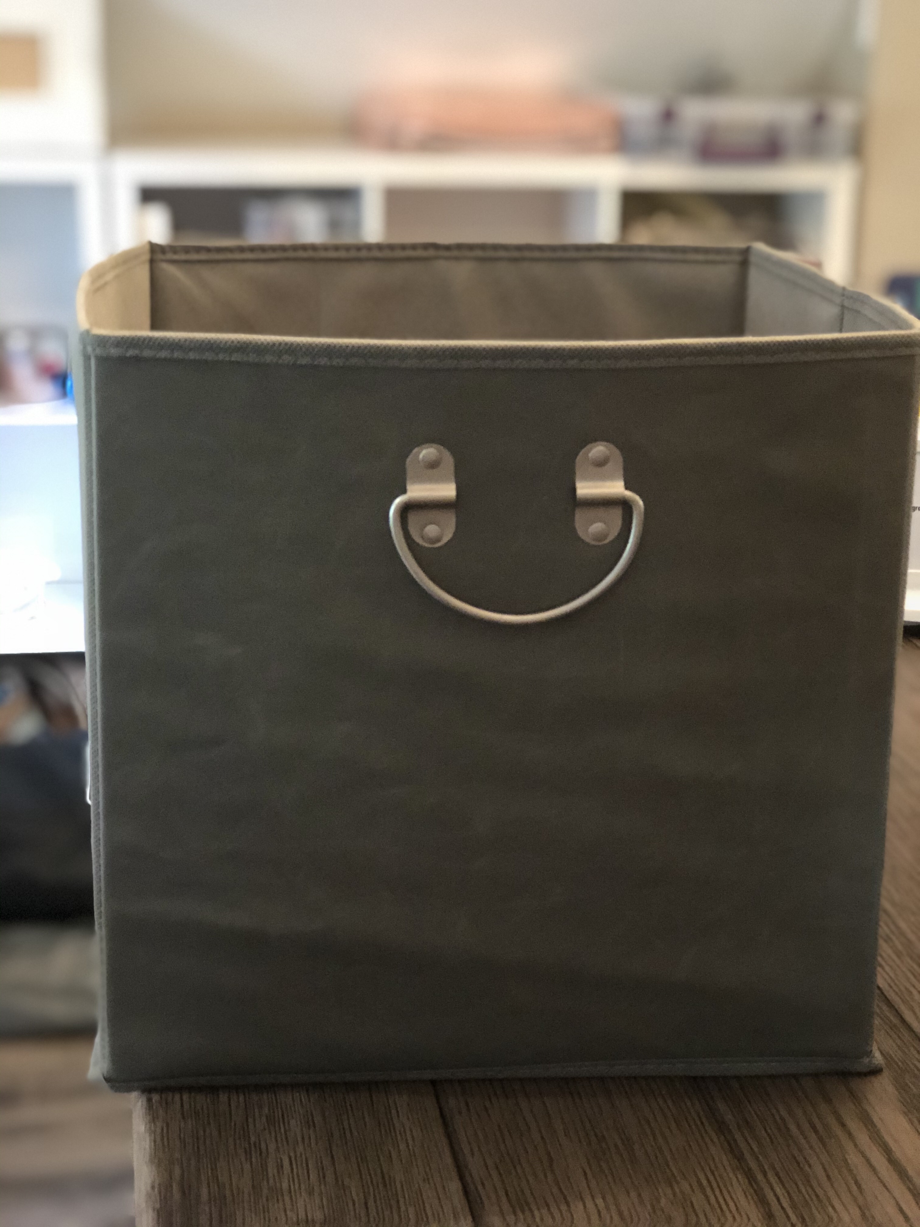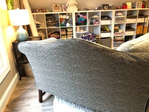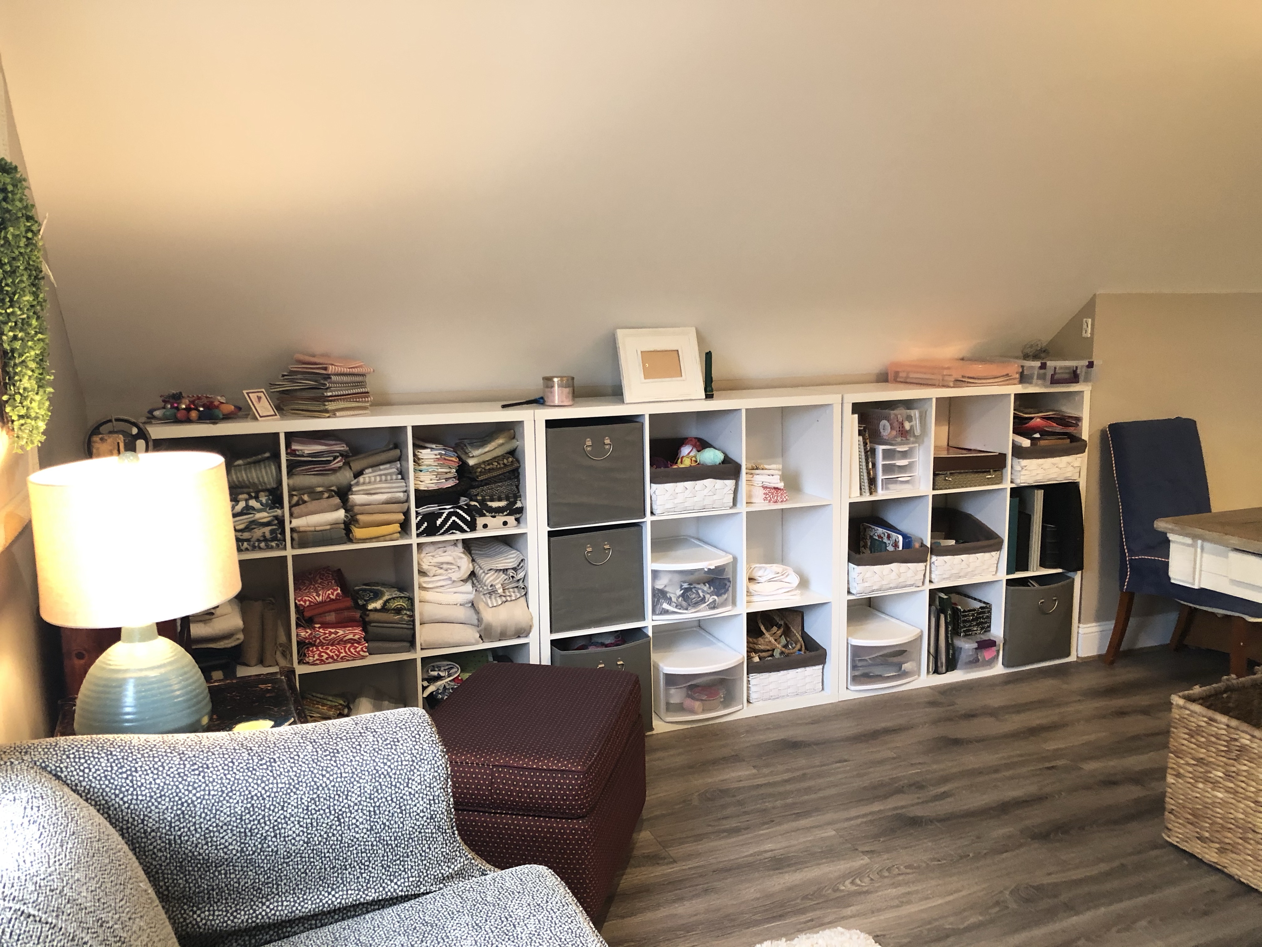 The workroom space had a perfect cantilevered nook on both sides but instead of having built in cabinets, we purchased three 9-cubbie cubicles from Lowes which fit in the space perfectly. I repurposed eight rusty colored baskets from another shelf that I had for years. I spray painted the baskets white and using leftover gray linen fabric, made basket liners to coordinate with a few more leather-looking gray storage boxes I purchased from Lowes. These twelve baskets and boxes will allow for ample storage options for craft and sewing supplies.
