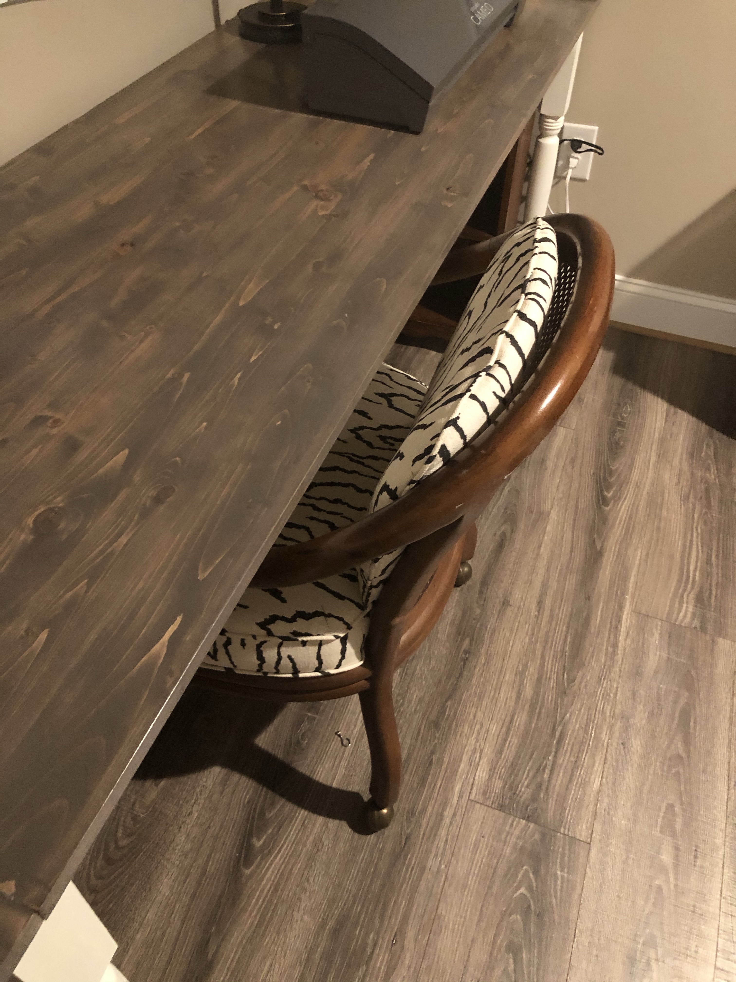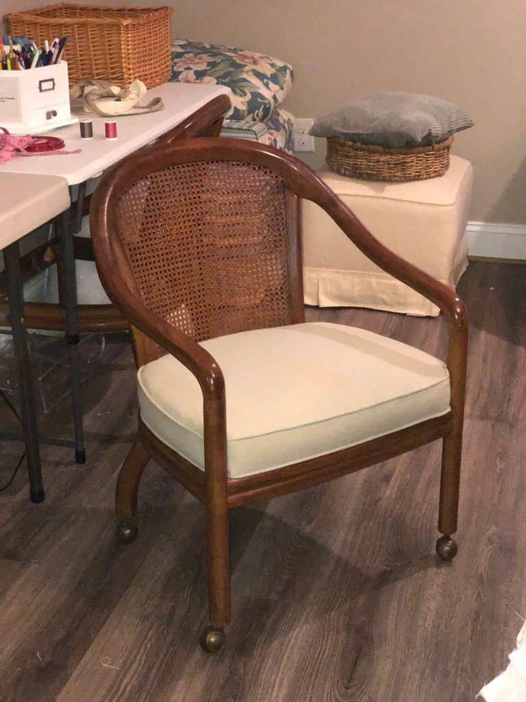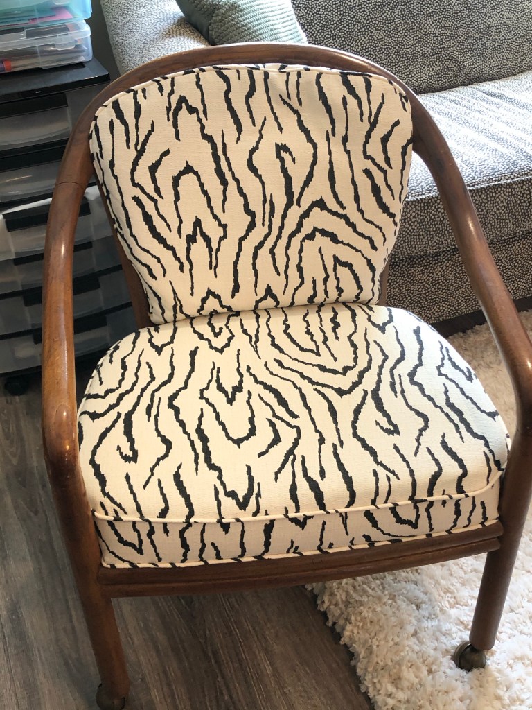 I picked up a set up matching cane-back chairs for twenty dollars for both! I wasn’t sure what I would use them for at the time, but for that price, I thought I would use them as practice pieces. But I found the perfect use for them as my work space table chairs. Some new foam and funky fabric in a zebra print and I’m all set.