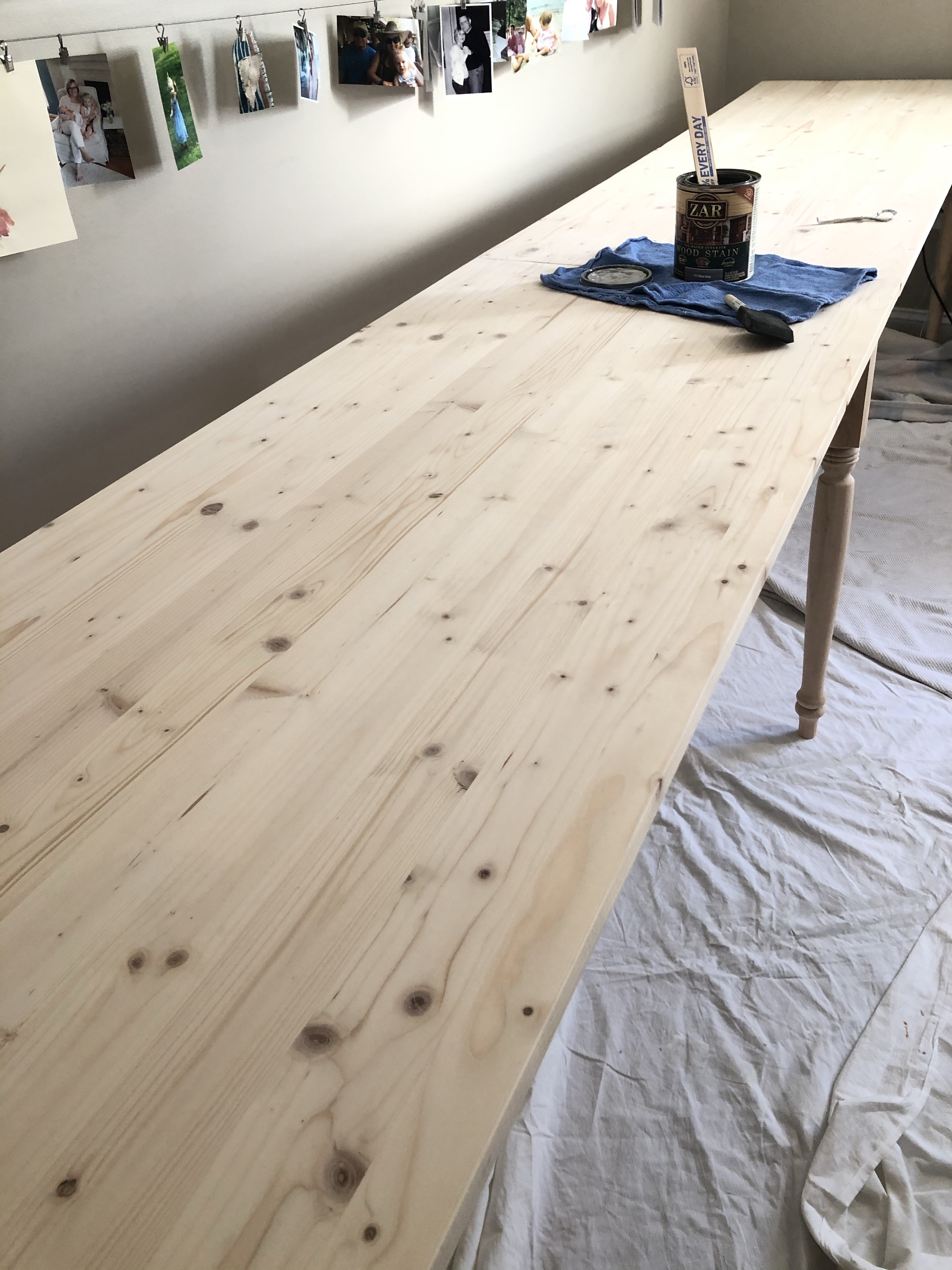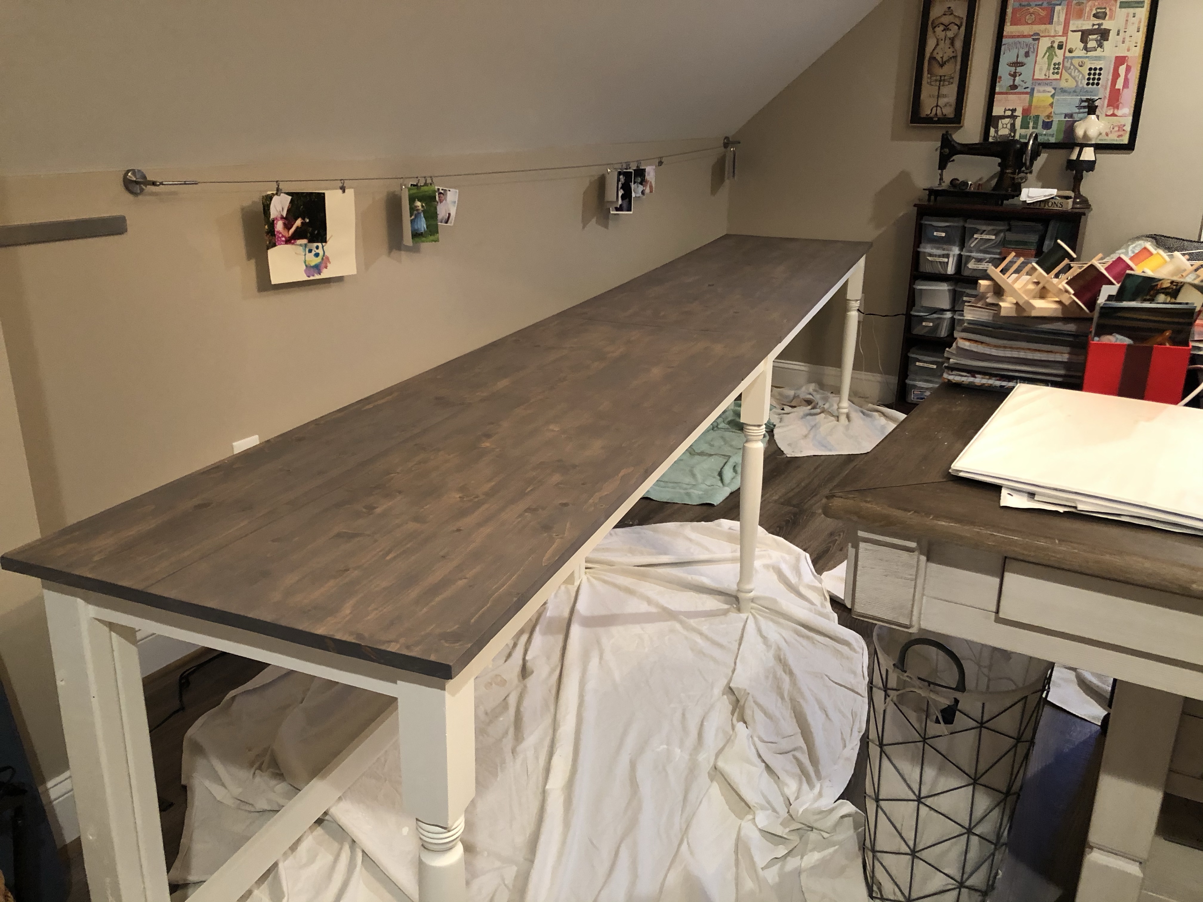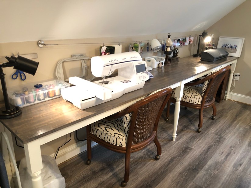 My husband made a long pine work table to nestle nicely in the right side of the room cantilever. It’s taken me two years, but I finally painted the bottom white and stained the top to match the floor and other work table. It is a perfect use of space to put my Cameo and embroidery machines.