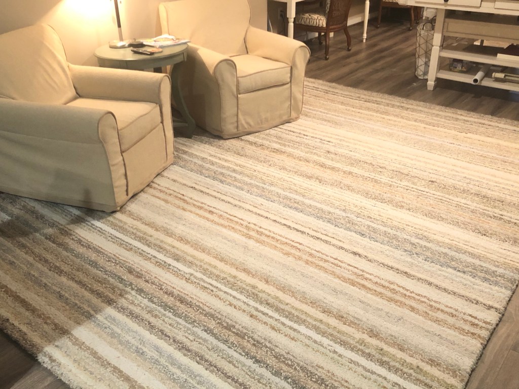 Can I just tell you about this awesome rug? The space needed a large area rug and they are not cheap! I really didn’t want to throw down $300-$400 on a large rug but I wanted something thick, comfortable and well-made. By pure luck, we happened upon a twice a year rug sale at a local rug making company in Rocky Mount, VA. Disappointed in their selection I actually noticed this large rolled up rug on our way out for sale by a group that support animal shelters.