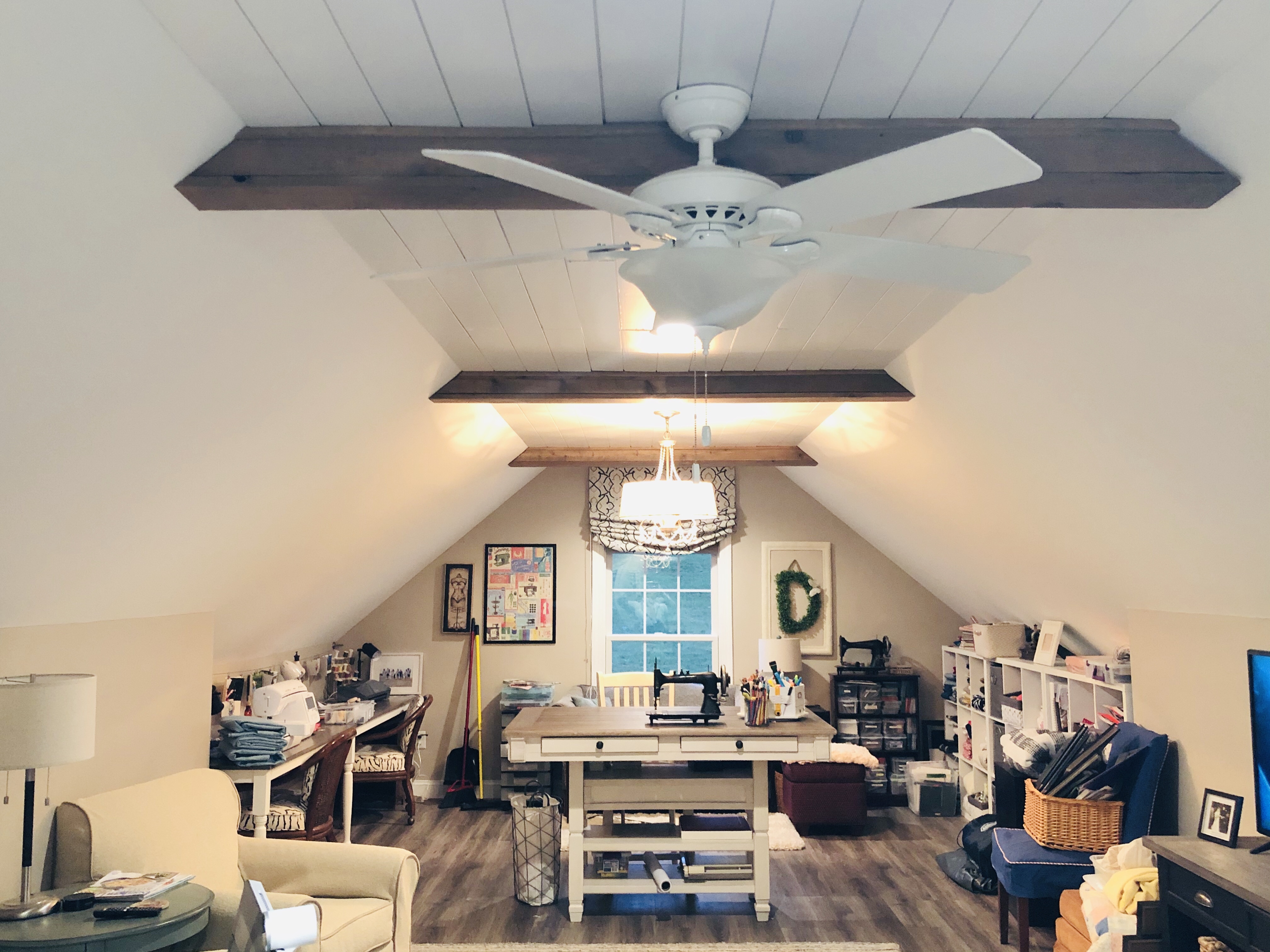 To add some interest, we splurged with a shiplap ceiling with beams to break up the length of the room. I chose a white ceiling fan so as not to interfere with the view of the pretty ceiling light fixture and my awesome craft table.