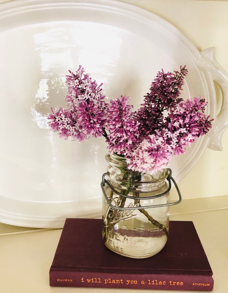My love affair with lilacs began when I was a girl growing up on a farm in Minnesota. My mom had a lilac tree in our front yard and I used to love to cut stems with the heavy large blooms and put them in a mason jar, ready for mom when she got home from work. I loved them so much that I had originally wanted them somehow in my wedding if not with actual lilacs, the color of my bridesmaid dresses. As it turned out I decided on burgundy to match the “blood” stripe of my husband’s Marine dress blues.