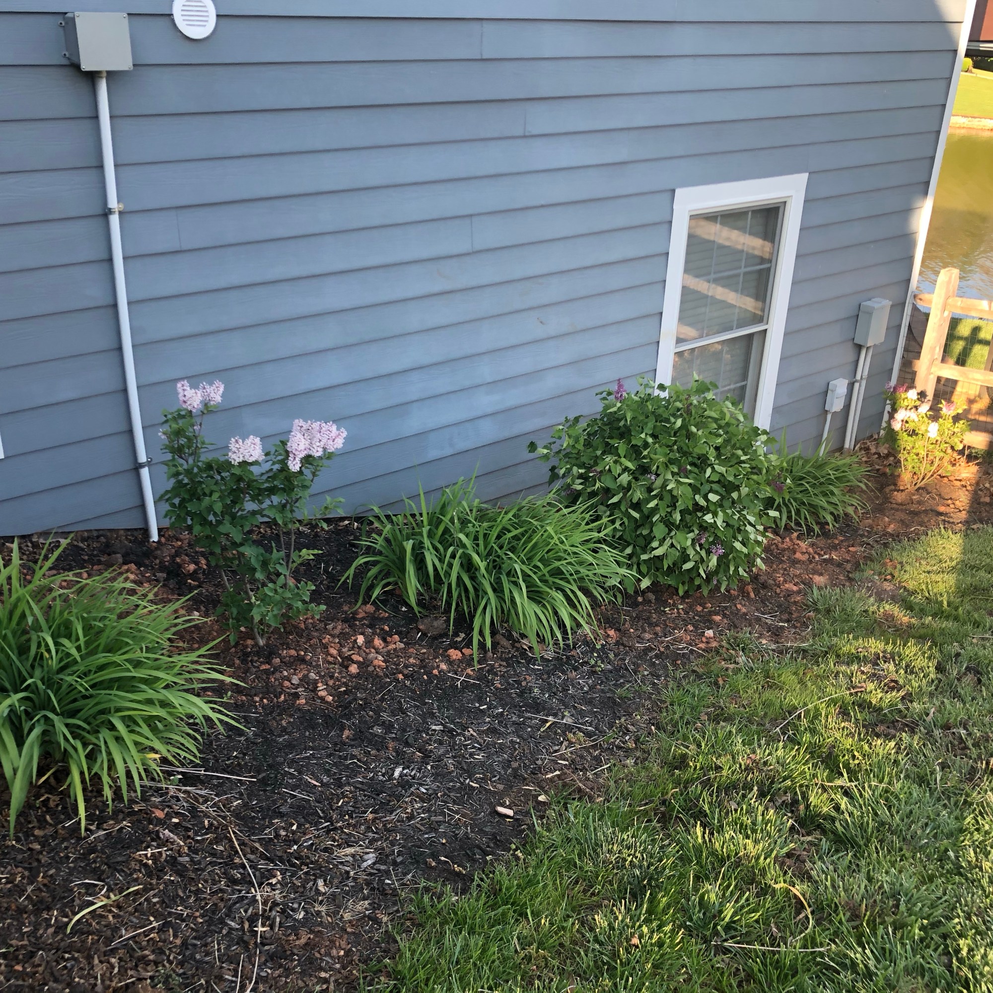 It would be a beautiful place to space out the lilac shrubs with a day lily in between them. So with the help of my husband, we dug out the lilac bush, gave it a new sunny home, and planted two new lilac bushes in the same area. A little mulch and it will be beautiful. It will get full sun, good water from the lake sprinkler system and great drainage. The blue/gray house behind them will be a perfect backdrop for the purple lilacs in the spring and the yellow day lilies all summer.