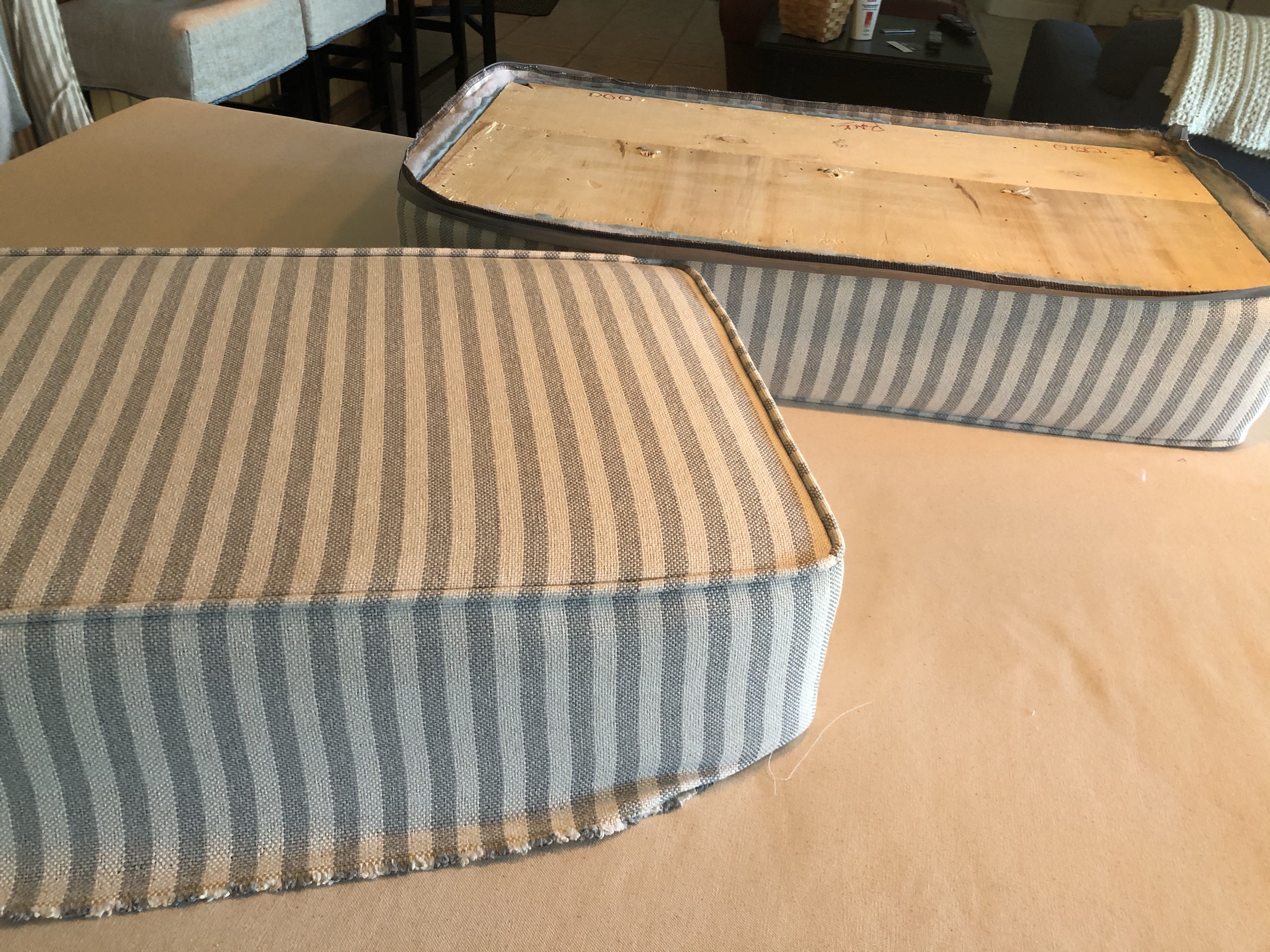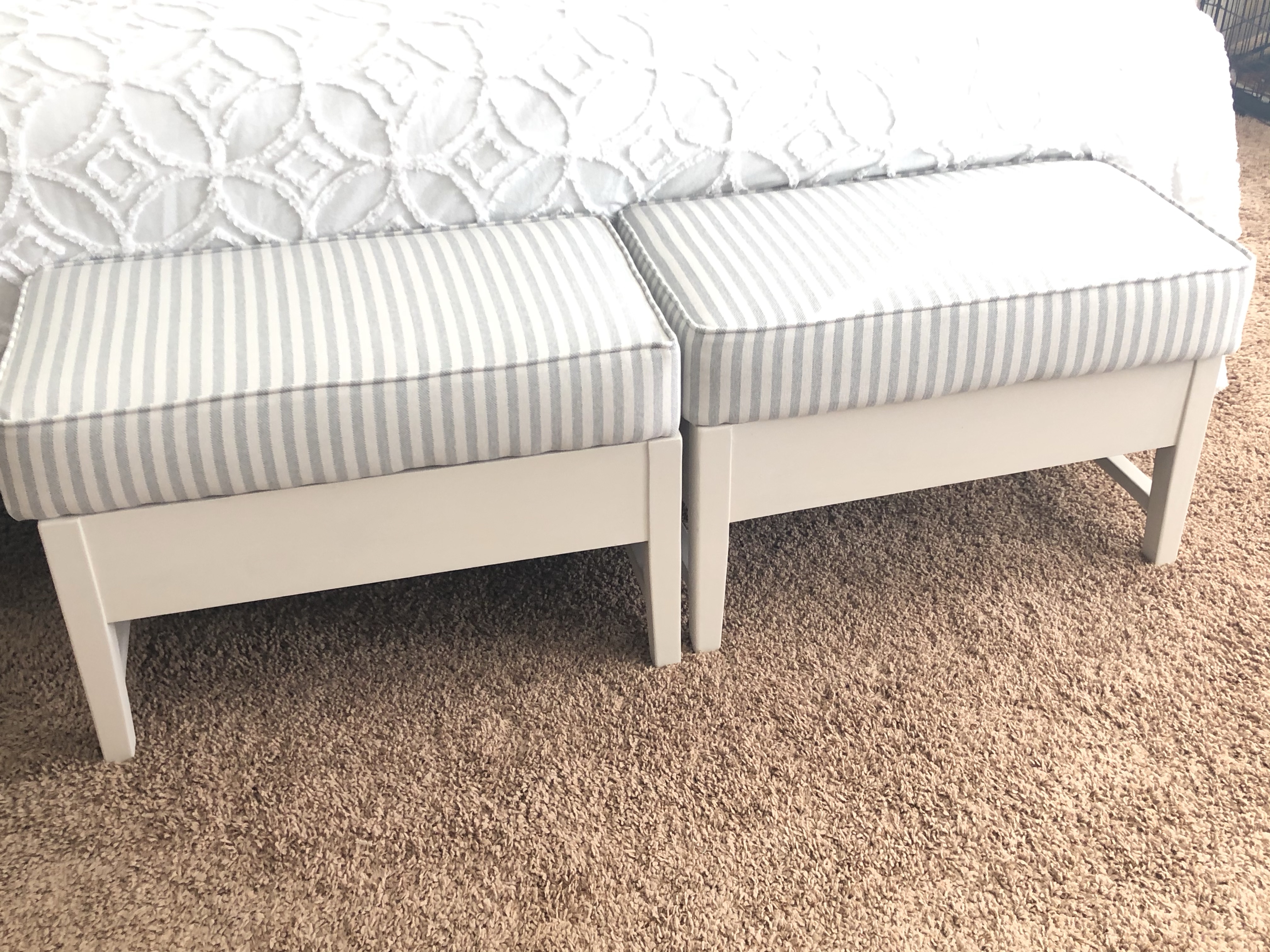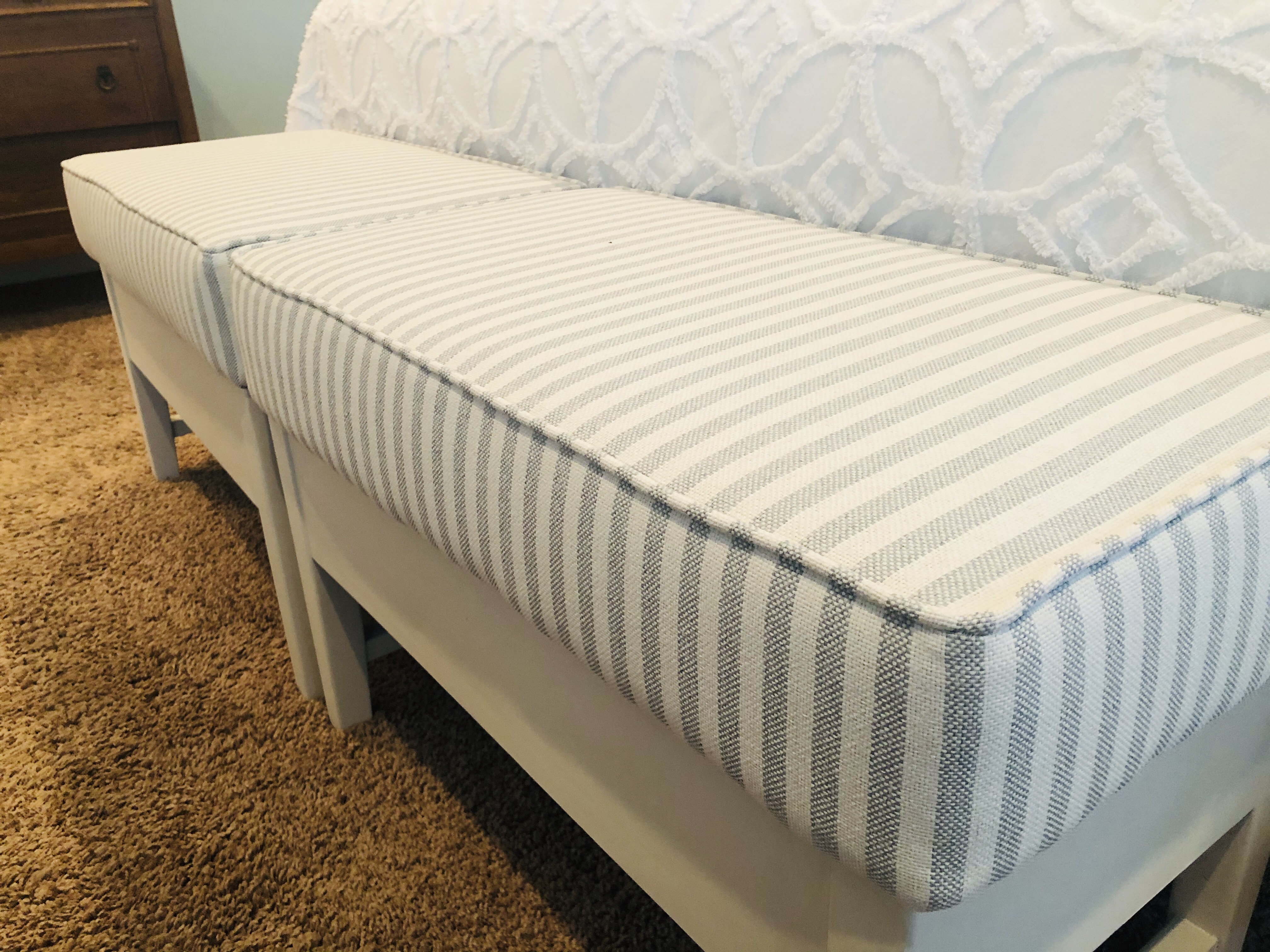 Almost immediately when I first purchased these benches, I covered them with a lighter cream colored top. I didn’t go through too much effort, just made a simple corded top and stapled it to the bottom. They stayed that way for several years and after several attempts to clean them (good grief…white cushions for a foot stool at the lake!), I decided that I was just going to remove the covers I made and go natural. The good news was that they were clean and like new. The bad news, was that the foam had deteriorated and lost it’s plumpness. The fabric looked saggy. I moved them to the end of our bed and in their current state, were fine for a couple years.