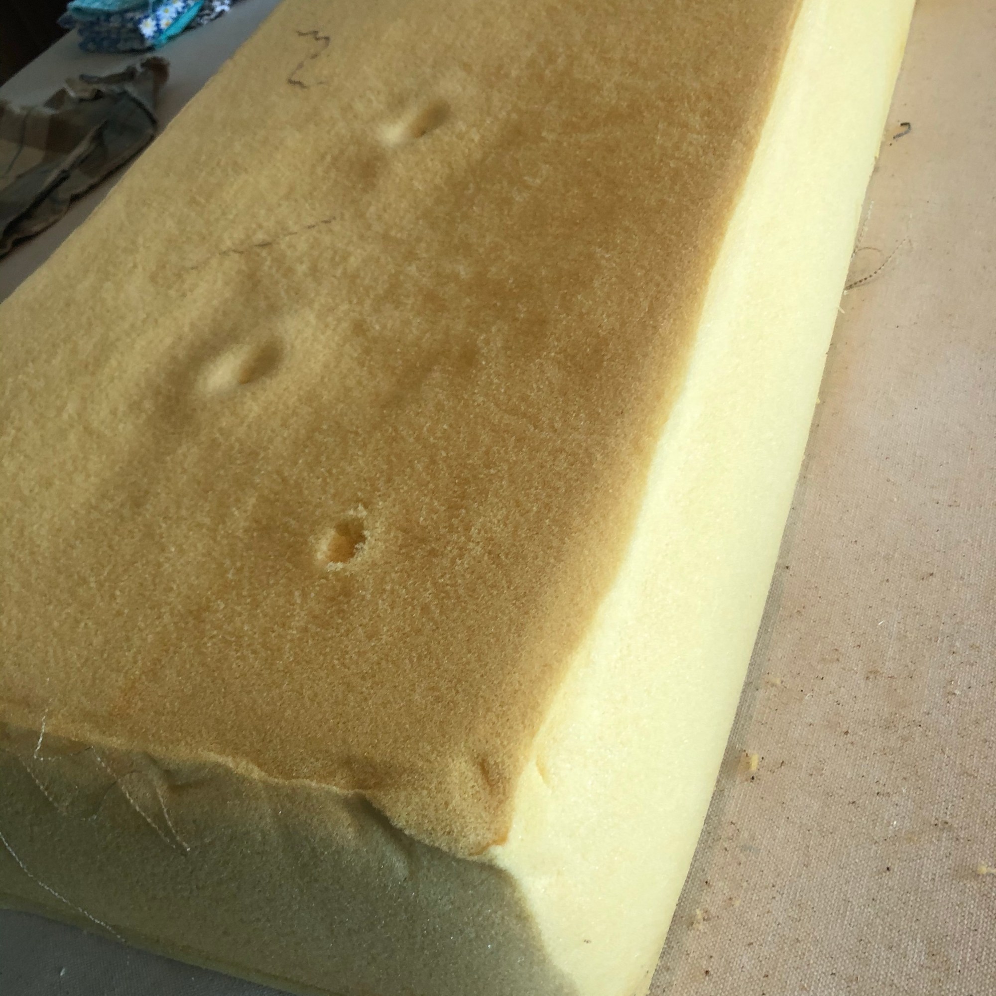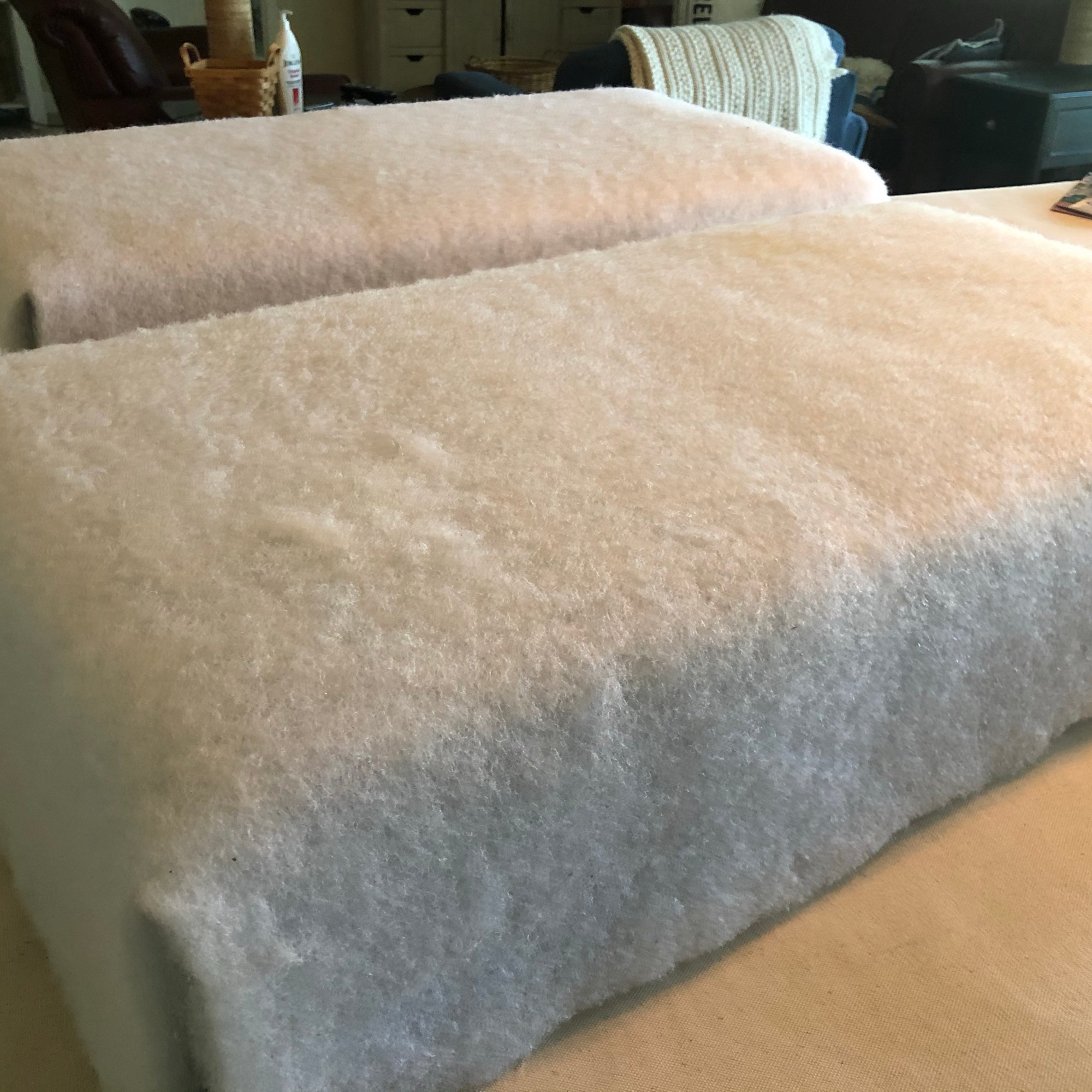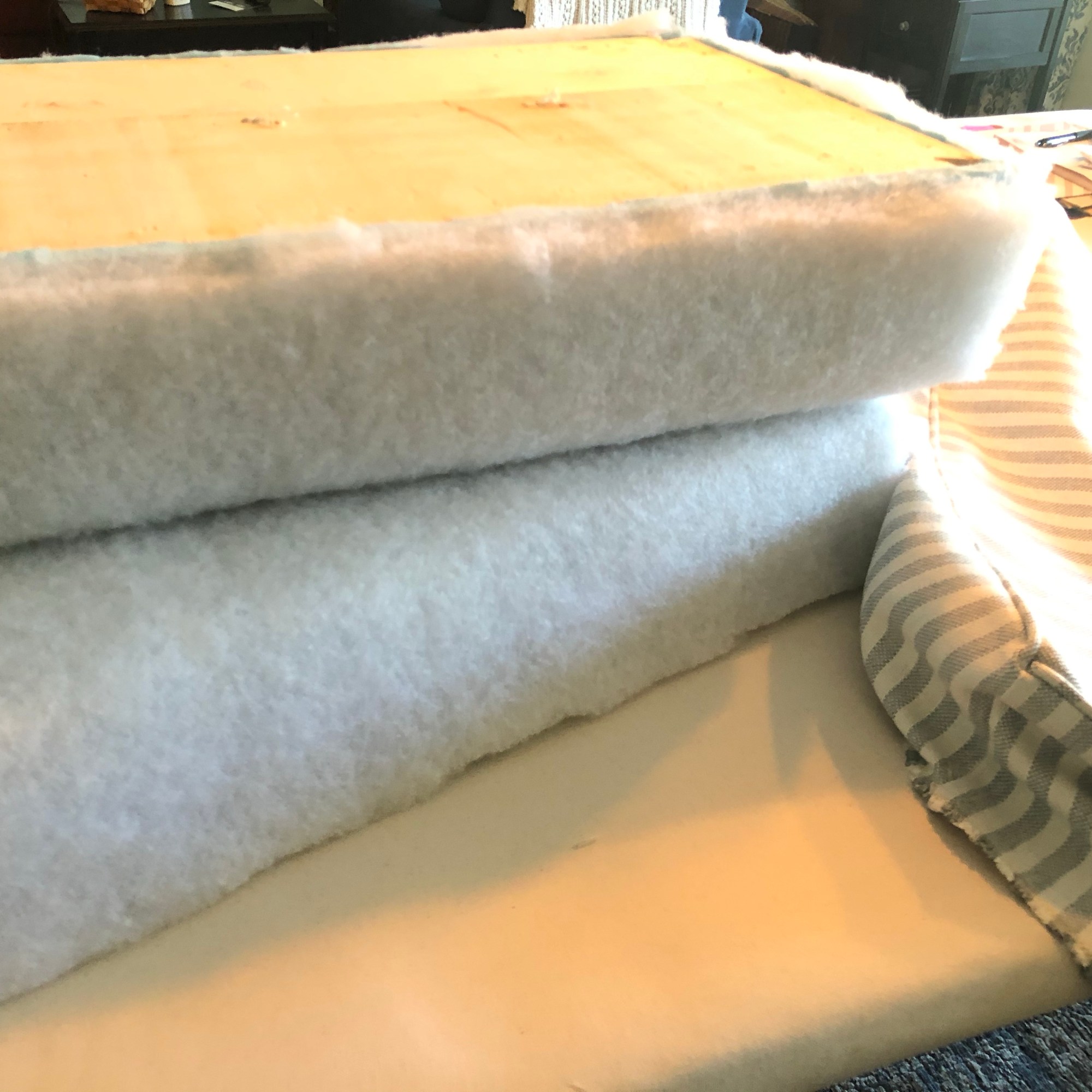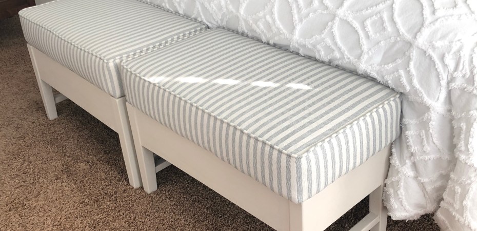 Almost immediately when I first purchased these benches, I covered them with a lighter cream colored top. I didn’t go through too much effort, just made a simple corded top and stapled it to the bottom. They stayed that way for several years and after several attempts to clean them (good grief…white cushions for a foot stool at the lake!), I decided that I was just going to remove the covers I made and go natural. The good news was that they were clean and like new. The bad news, was that the foam had deteriorated and lost it’s plumpness. The fabric looked saggy. I moved them to the end of our bed and in their current state, were fine for a couple years.
