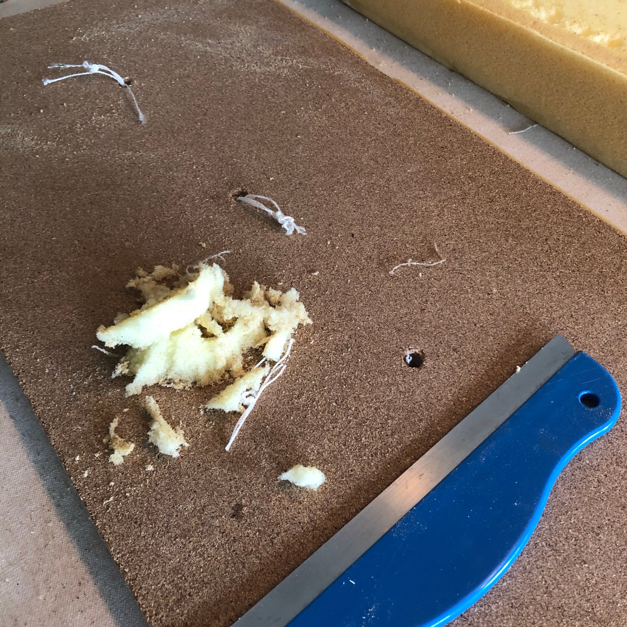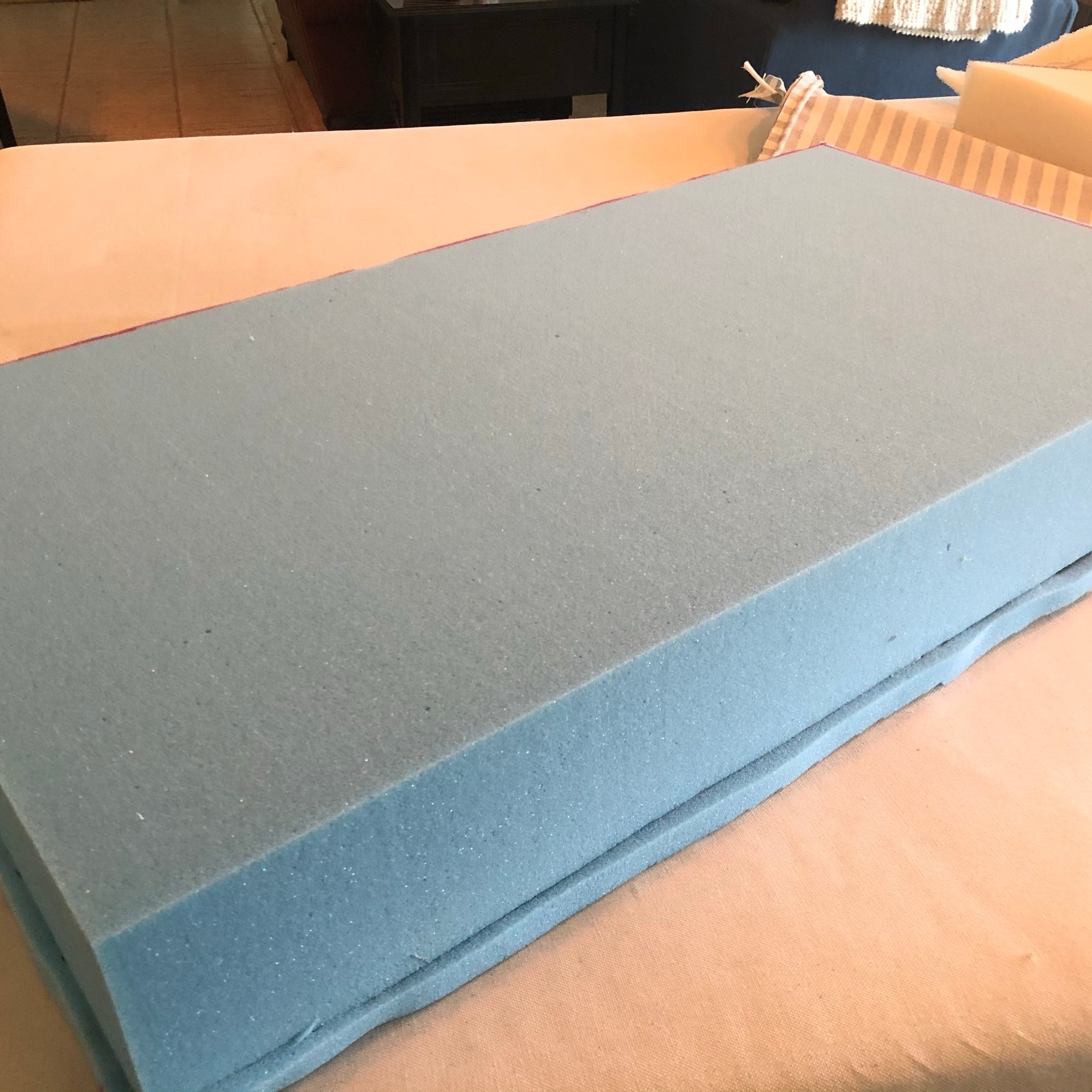 The Foam Factory actually cut the foam to the exact dimensions I needed so when it came vacuum packed, I needed to wait a day for it to expand to its exact dimensions before I could move forward. Once it was ready, I wrapped the top with a cushion wrap to give it a cushy plump top. I wanted to create the continuous line of the stripe from front to back and down the front of the bench so instead of cutting the cording on a bias, I cut it straight. Matching up the stripes is not as easy as it looks.