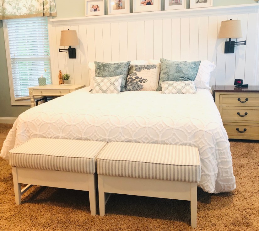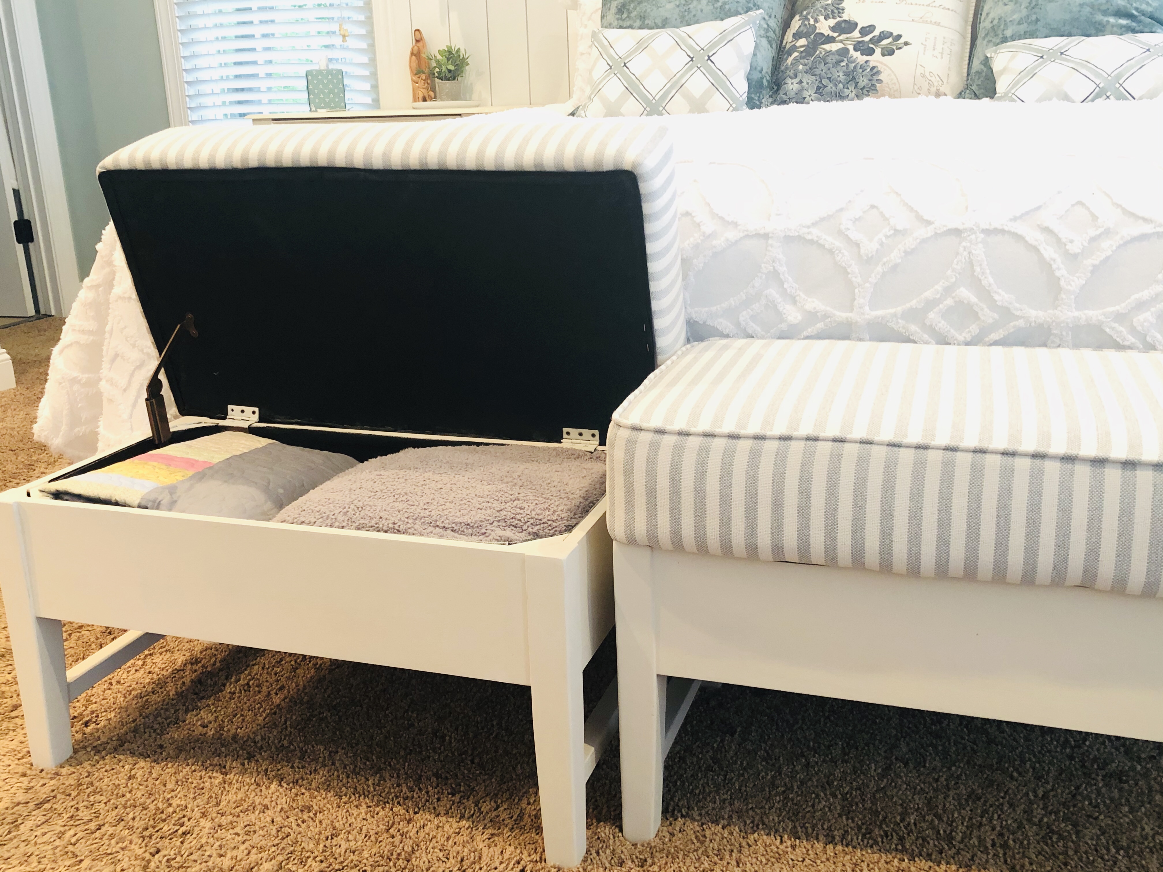 I’ve had these Target benches for over ten years. They were first used as an ottoman in our first lakehouse and then as ottomans in our current lake house. As with most of my furniture, they made the rounds to different rooms when I got the itch to move things around. They would eventually make their way to the end of our master bedroom bed to serve as a sitting area as well as a much needed storage for sheets and extra blankets.