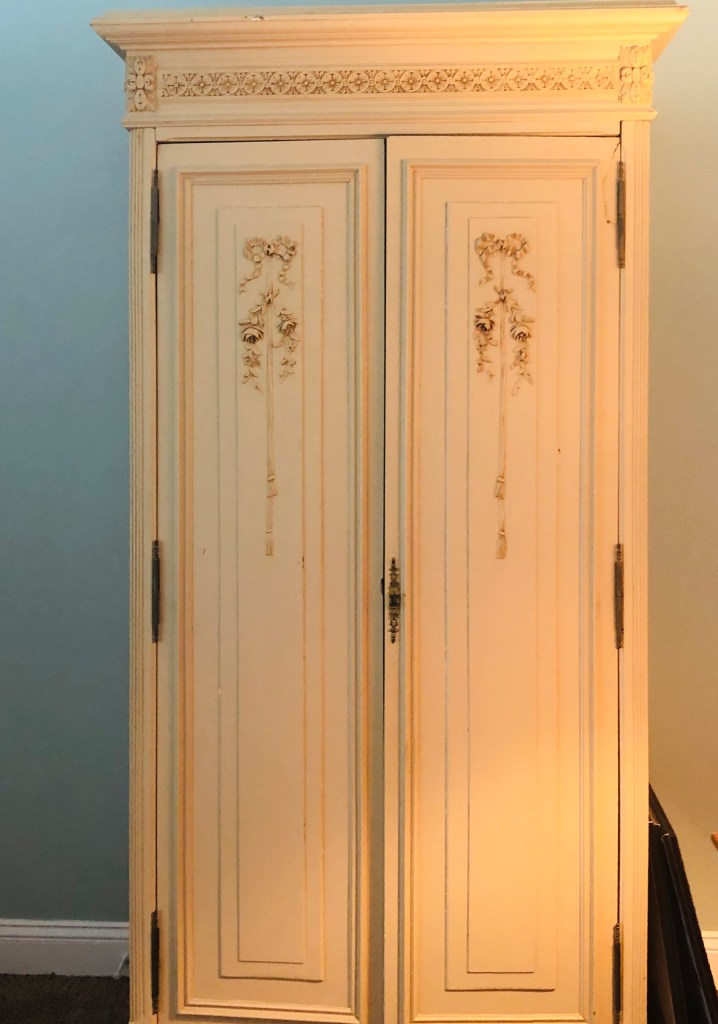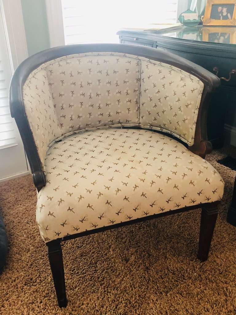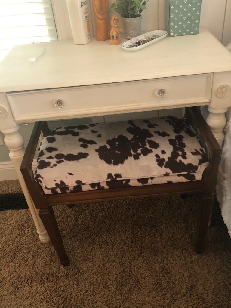 I have a few more pieces of furniture in this room that need a little makeover with new paint and upholstery. The chair at my desk, a stool under a side table and my fabric storage armoire.