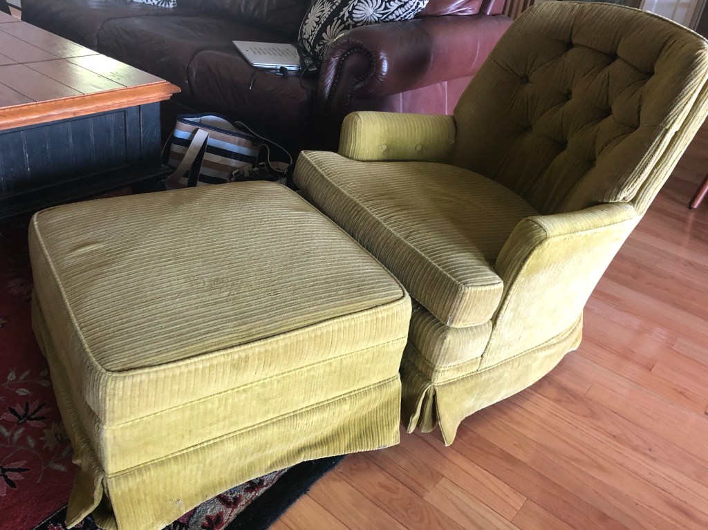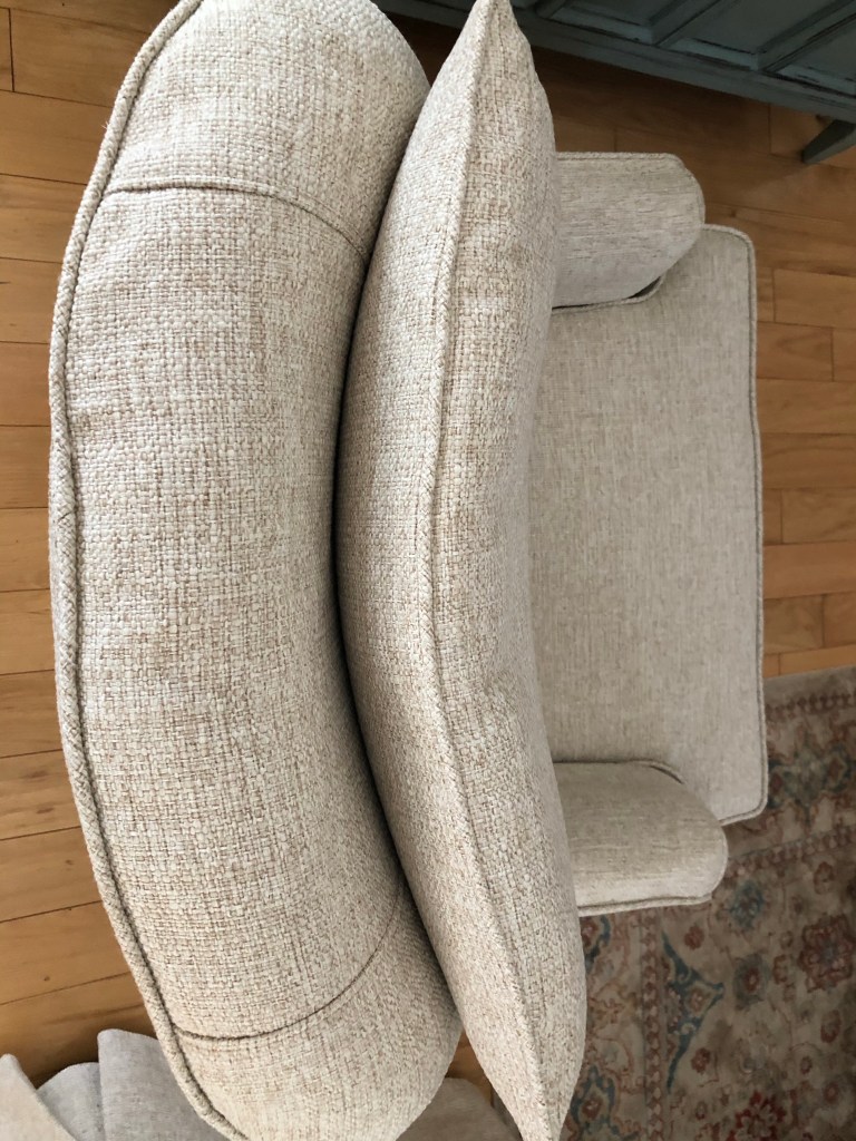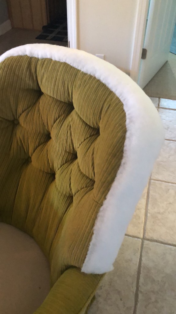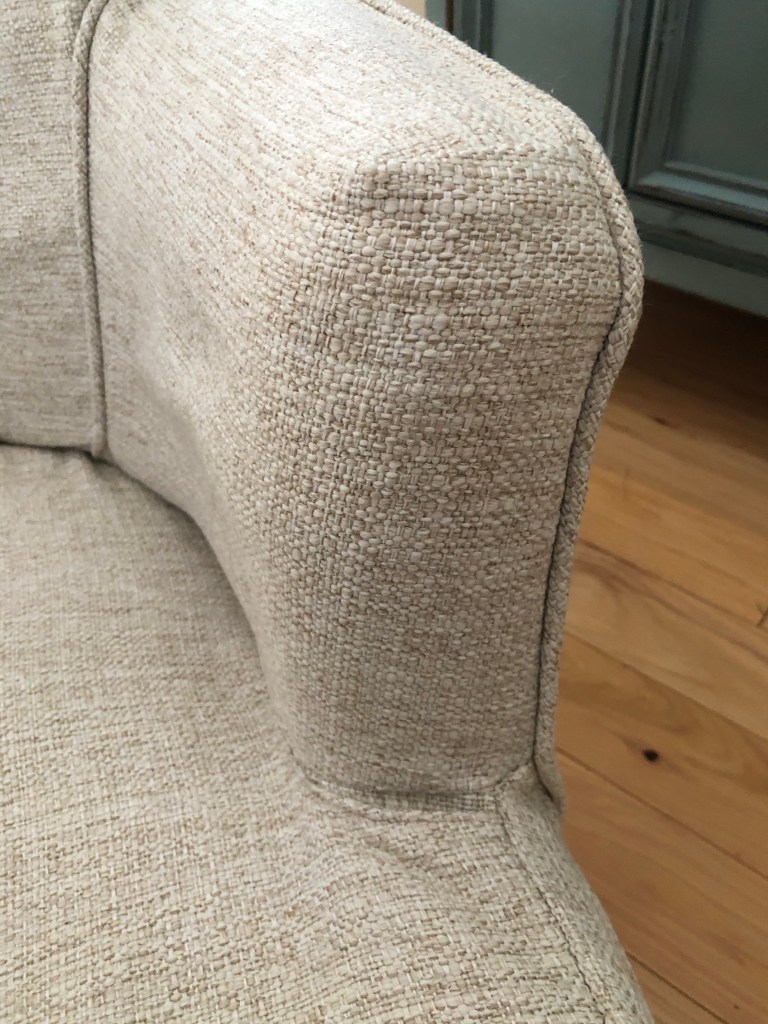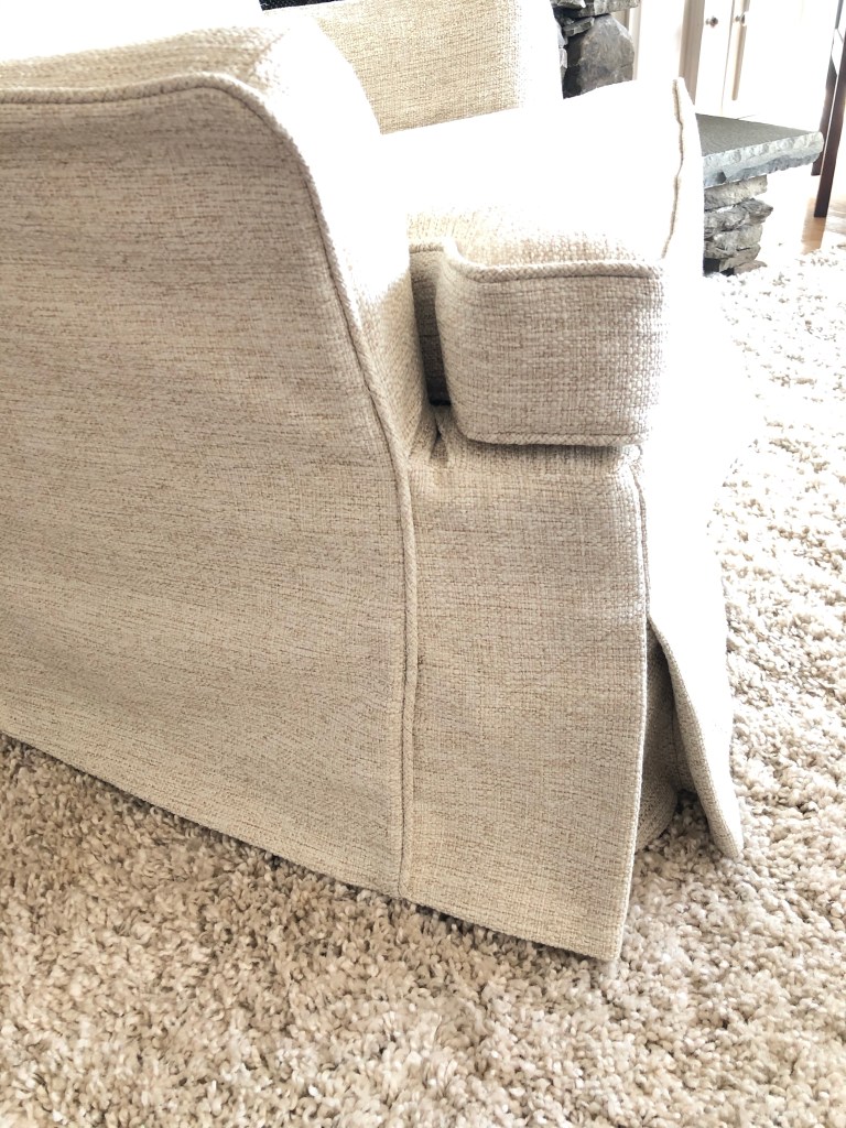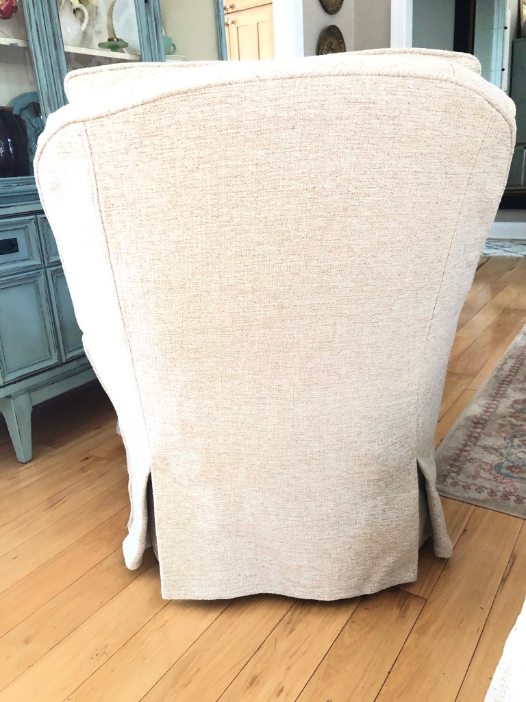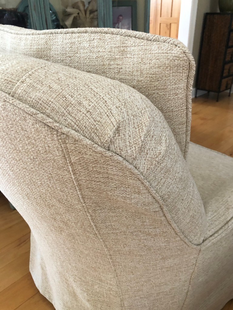 We had originally planned to do a regular corner pleated skirt. However, after some consideration, I suggested we try a waterfall skirt that flows down from the body of the slipcover fabric rather than an attached skirt which would add a bit more bulk to the already heavy fabric and the existing skirt underneath. It would also give the chair a modern update, elevating it from the very dated greenish corduroy. I went about an inch longer as well to cover the metal legs of the chair that were somewhat exposed with the existing skirt and was an eyesore to my client.