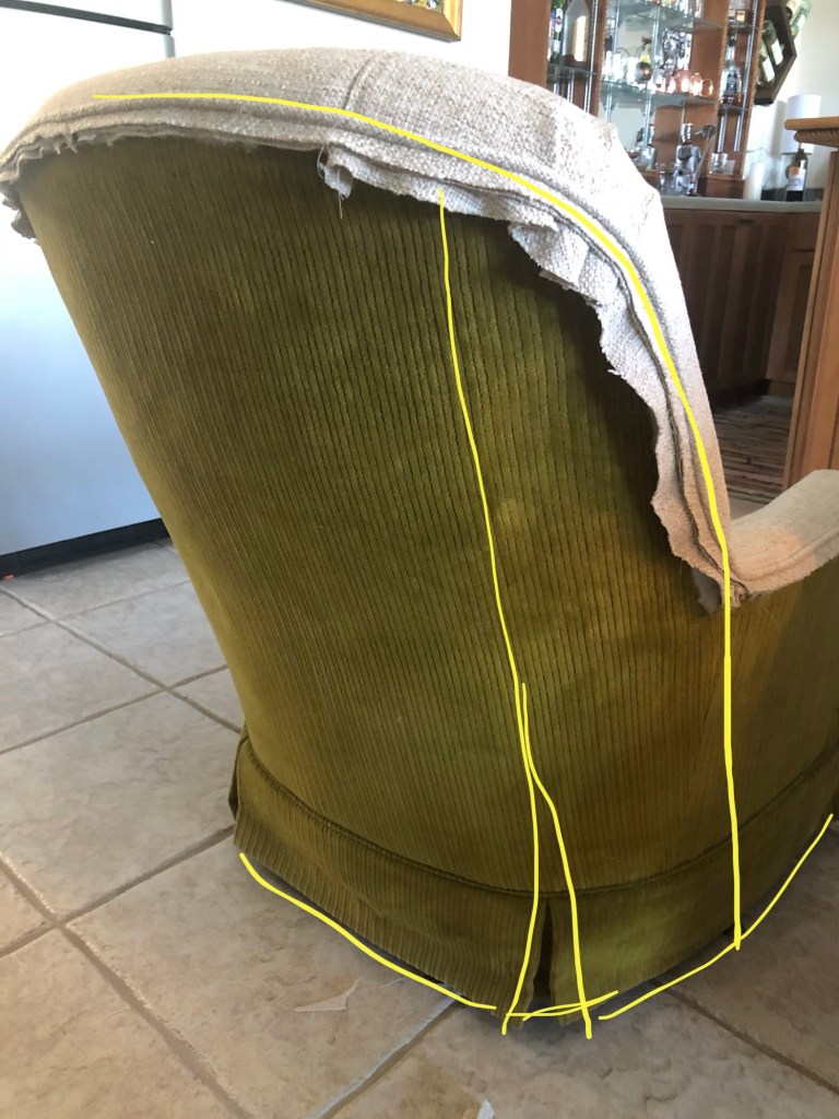 I usually like to study the chair for a bit and make notes as far as how to approach the slipcover process and design. But when I get stumped on what to do, I take pictures, mark it up and put it out to my “people” for advice on a Slipcover Network Facebook group. Often times, just taking the pictures and looking at it from another perspective gives me an idea on how to approach something.