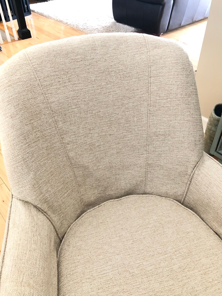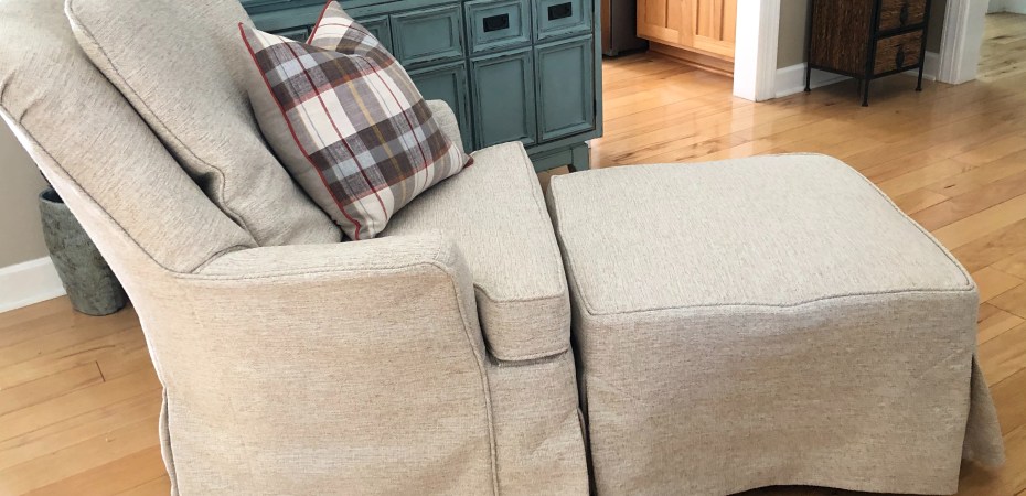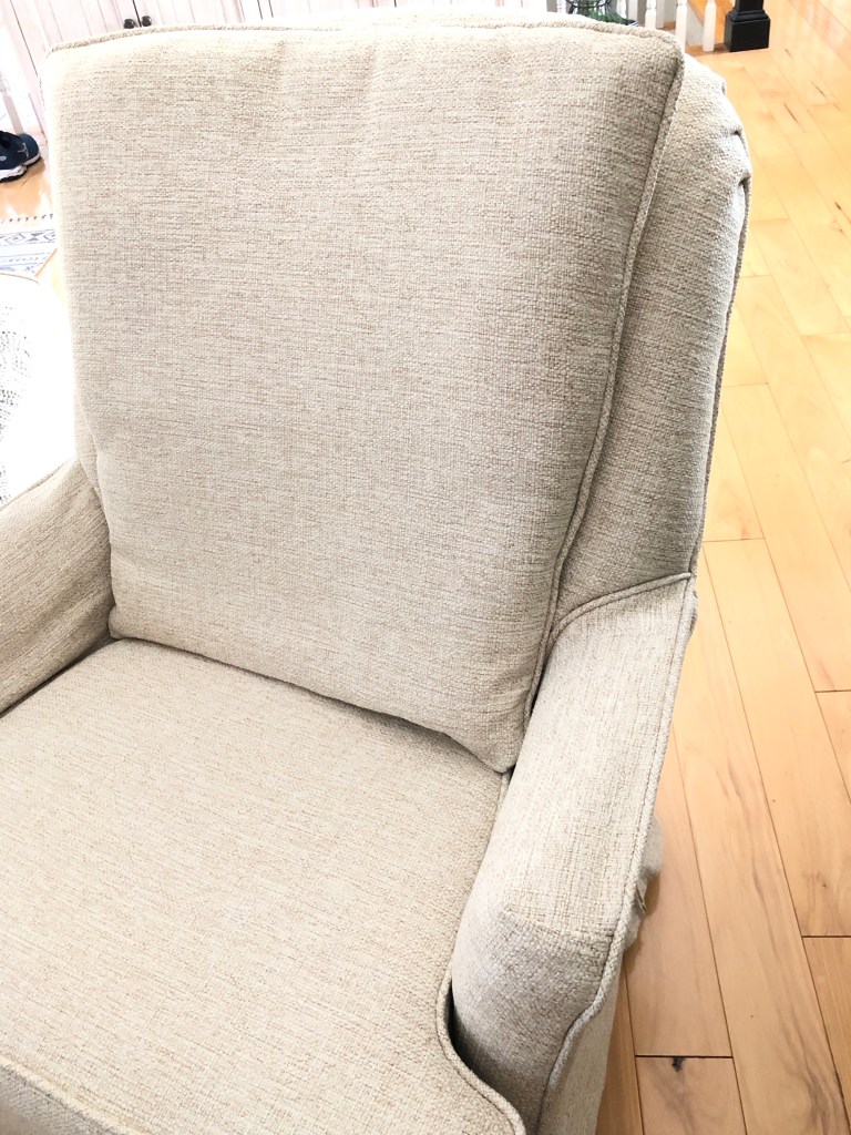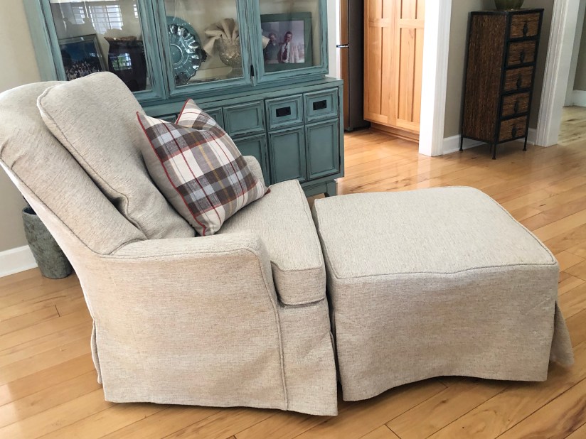 Oh how cozy! Not your ugly green corduroy chair anymore! This neutral, textured, linen-looking fabric will fit into any setting beautifully.