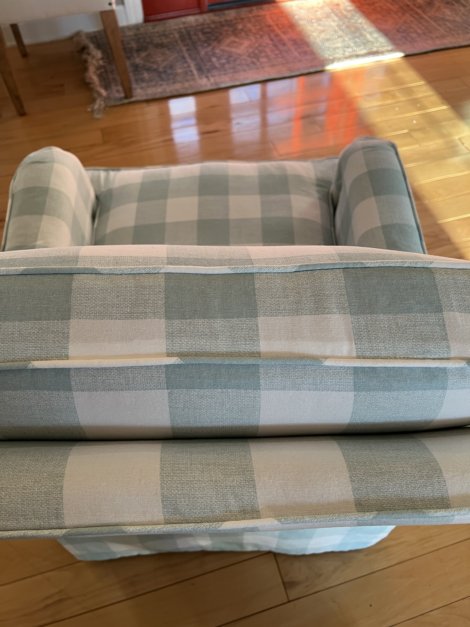 My client pre washed the fabric per my instructions and the fabric shrunk quite a bit, about twelve inches for each five yard cut. I slowly and carefully set out to cut the fabric piece by piece as I needed them (in duplicate for the second slipcover) being extra careful to match up the checks both vertically and horizontally on all the areas that it would matter. I would need to match up the front to the back, the outer arms to the inner arms and with each side, the front decking to the front and the seat and back cushions to each other was well as to the chair. Whew! I definitely had to be on my game and paying attention!