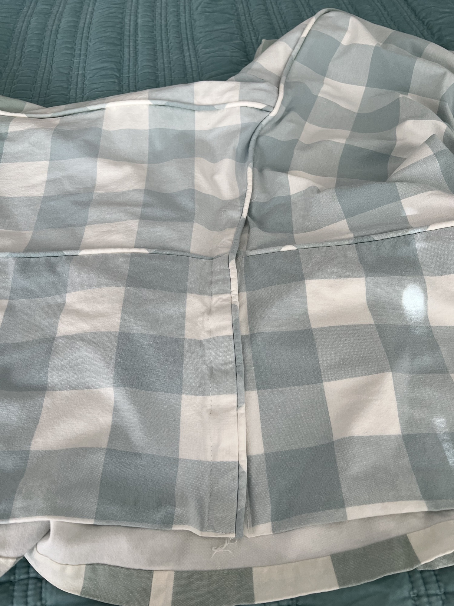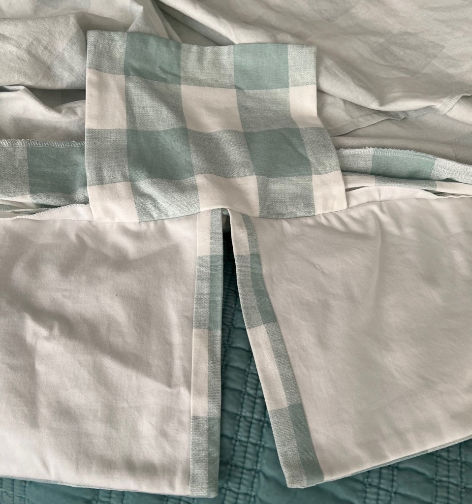 Instead of a continuous skirt all the way around I made four separate panels for the sides. A separate gusset panel would go in each corner after the main skirt panels were sewn on. I love this method of doing skirts as it is easier to handle so much fabric, to match up the plaids and make adjustments.