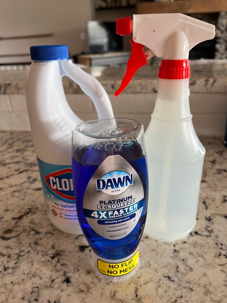 - Spray the fabric with a solution of 1 cup bleach, 1/4 Dawn soap and 1 gallon of water and let it soak for 15 minutes. To avoid soap rings, spray the entire surface of your cushion.
