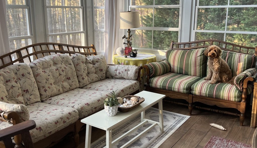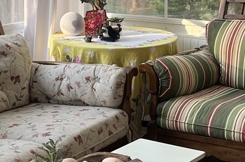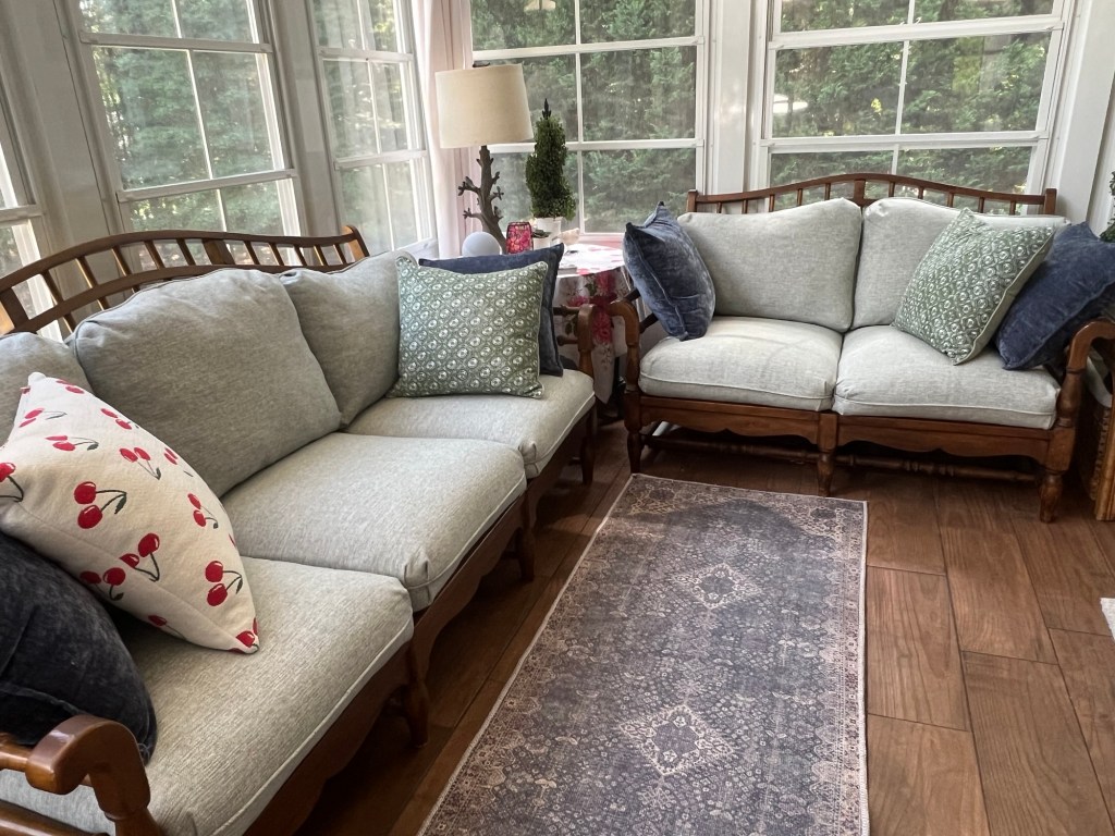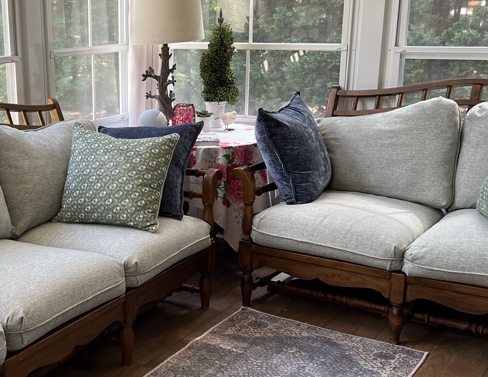 Little by little my cozy back porch is coming together. I think they call this “slow decorating”. I still need to find just the right ottoman or coffee table to place in front of the couch but I’m not in a big hurry.