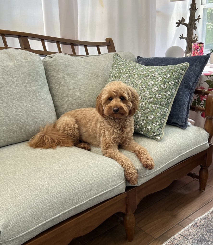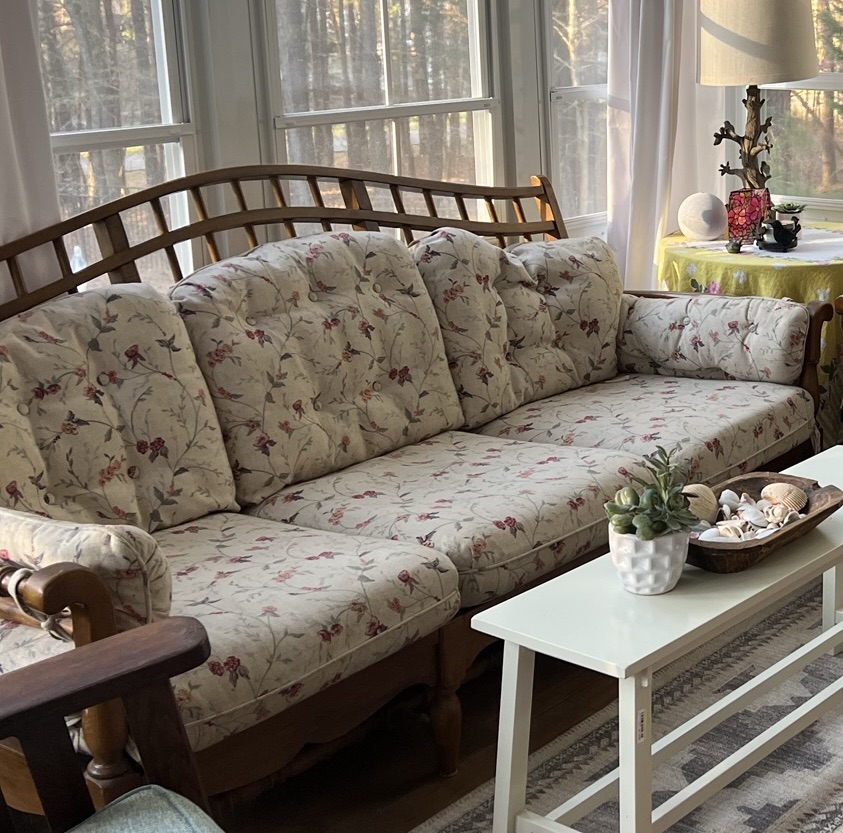 Scanning through Marketplace, I noticed an Ethan Allen wooden framed couch and thought it could work for one of the pieces. I purchased it for a steal at $100 at a local thrift shop.