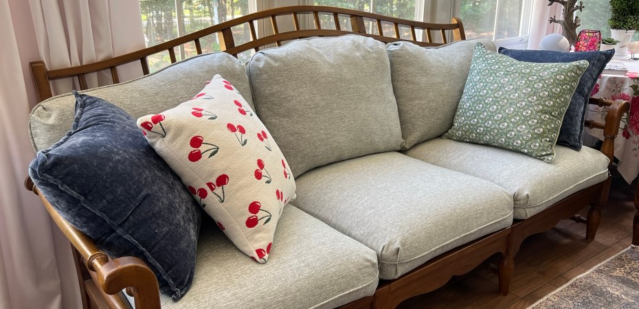 Instead of remaking the funky arm rest cushions, I opted to purchase some accent throw pillows to give it more updated look. They can be changed for the seasons but are also much more comfortable to rest your head and feet on for an afternoon nap.