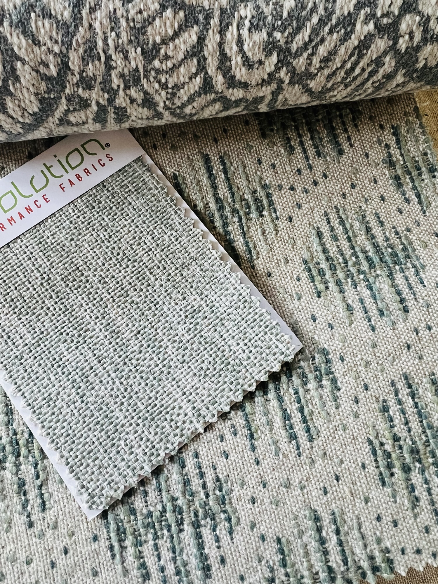 Now to get to work on recovering the cushions. I chose a performance fabric from Revolution Fabrics called Hailey in the color Seagrass. It would be the perfect neutral base color that would also go with the newly recovered chair seats for the table. This color is definitely becoming my signature color in my house. I think it plays nicely with the dark blues as well as with a pop of red which would bring a bit vintage fun when decorating for the seasons.