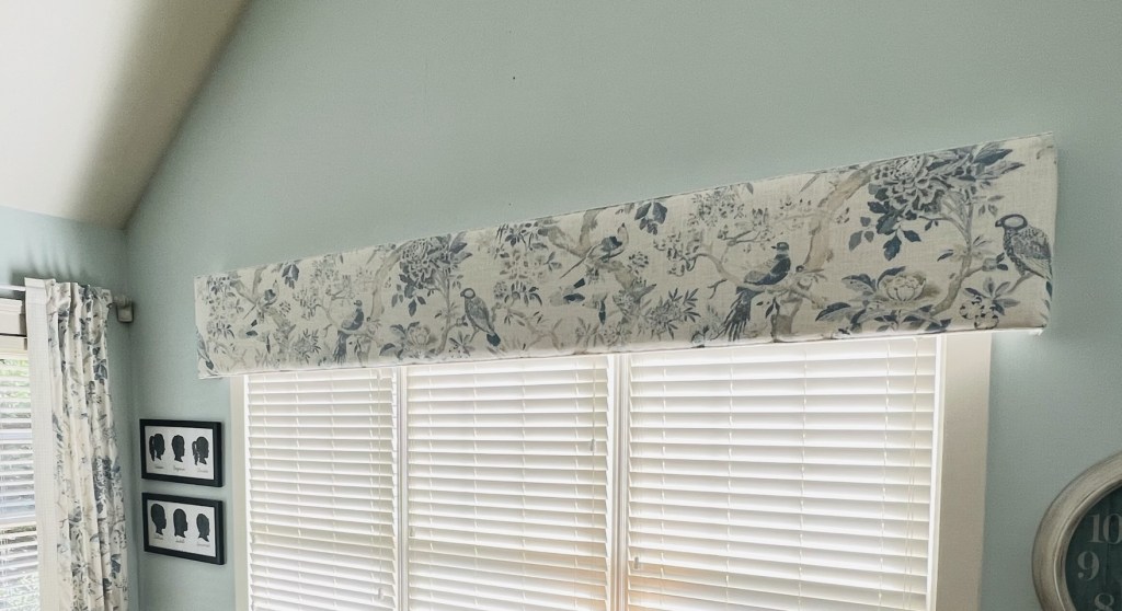 I decided the panels would not work on the big window of the adjacent window as they would look too skimpy with just half the width of the fabric. I opted instead on a cornice topper using the same fabric with a cording made with the checked white fabric. This way I would be able to actually see the design on the fabric and finish the window off with just the right amount of softness and without covering up the window too much. I think the vaulted ceilings handles the cornice treatment nicely and draws your eyes downward.