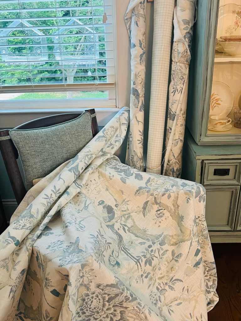 While in Roanoke for ten days early September, I bought three remnant pieces of a P Kaufman linen/cotten blend of fabric that I knew would be perfect for this room. I envisioned pinch pleated drapes on the two windows and large window over the desk. I would have to get creative to make the best use of the limited fabric but thankfully each remnant was at least three and a half yards as each panel would be 102” long.