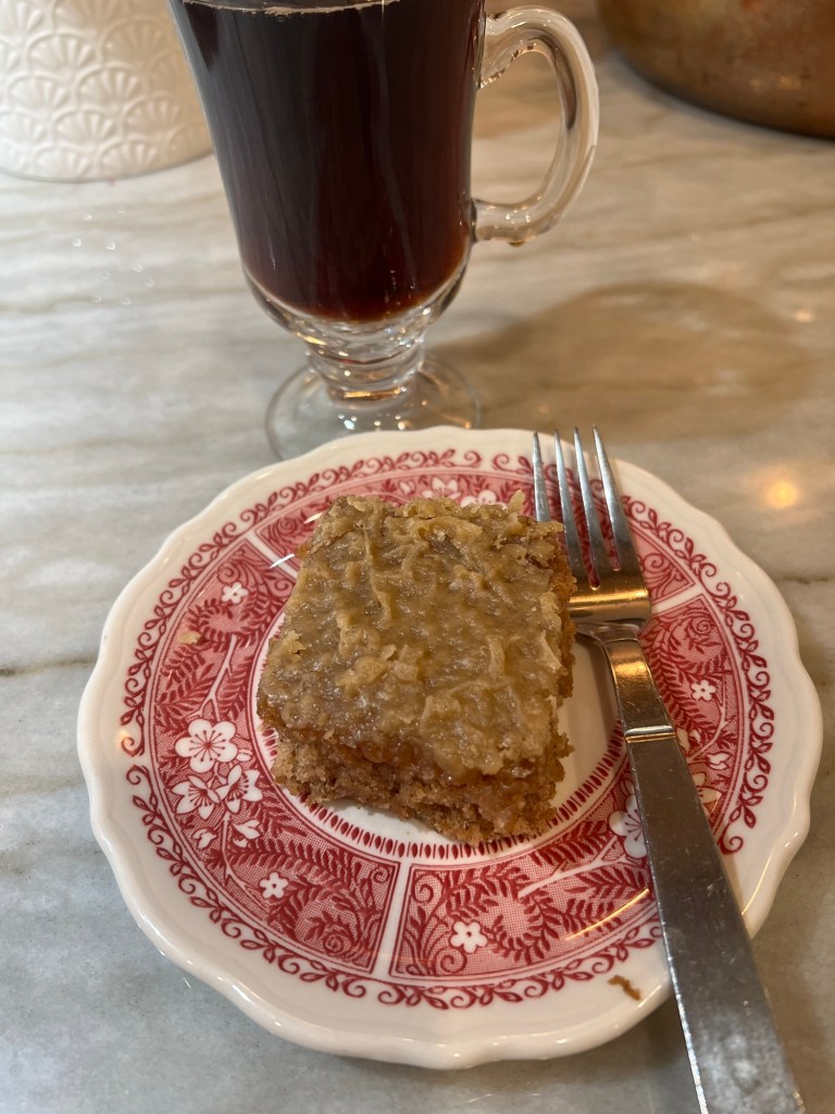 But I was thinking of cake. Cake just sounded comforting. I was thinking of a good old fashioned chocolate cake but then I remembered the old-fashioned oatmeal cake with coconut brown sugar frosting from my childhood and my mind was changed. I figured it would be fine as breakfast in a pinch since there is oatmeal in it (just kidding….pure indulgence).